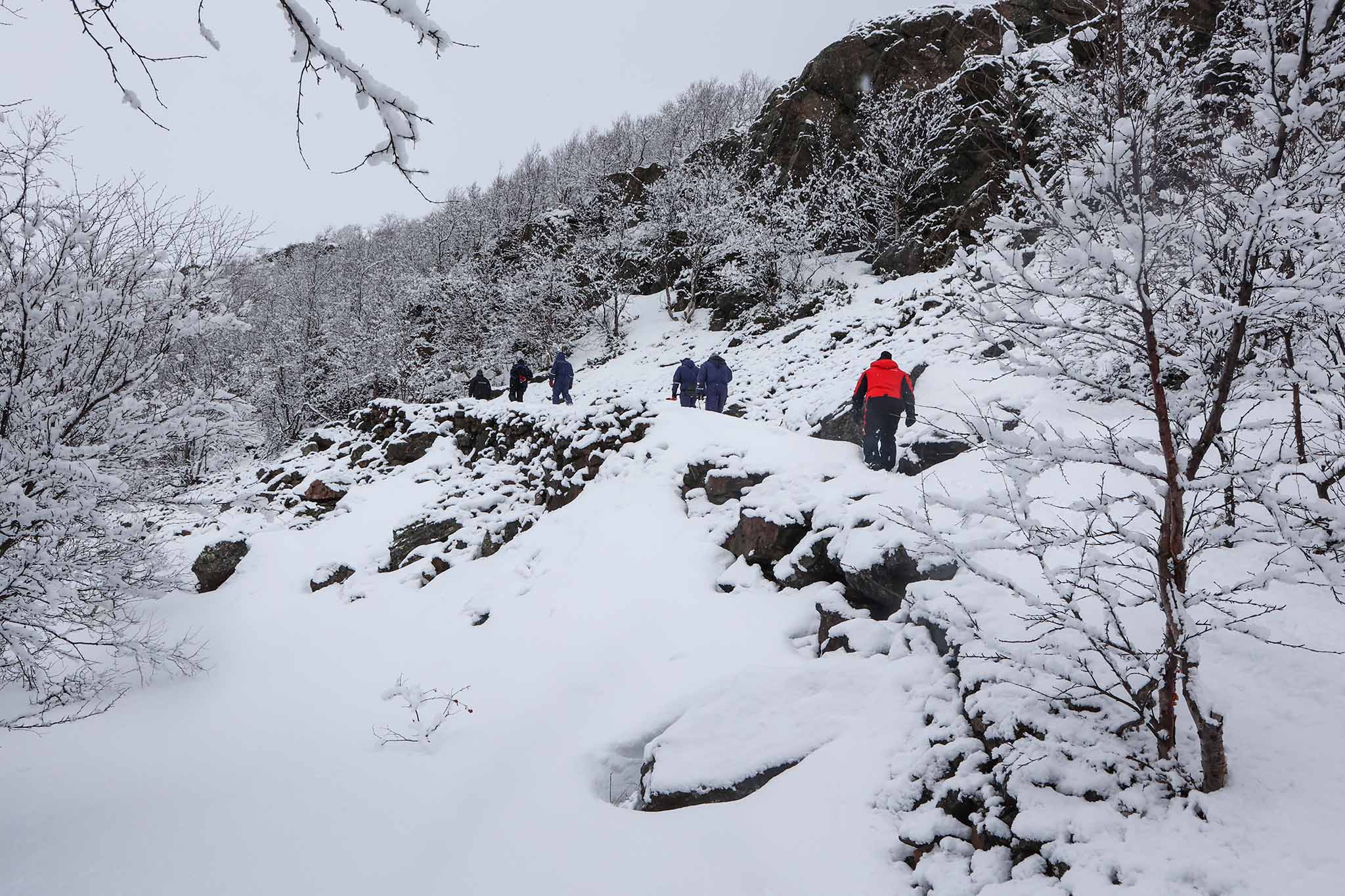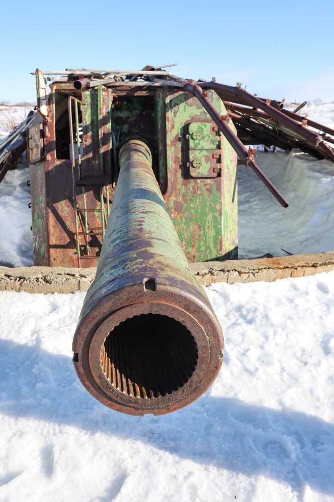 Пройдя проверку паспортов на погранпосте «Титовка» и оседлав снегоходы на базе Старая Титовка, берем курс на хребет Муста-Тунтури (название переводят с финского как «Черная тундра» или «Черная гора»), где в Великую Отечественную войну шли ожесточенные бои. Муста-Тунтури является естественной скальной преградой высотой до двух с половиной сотен метров, отделяющей от континента полуостров Средний (и следующий за ним Рыбачий).