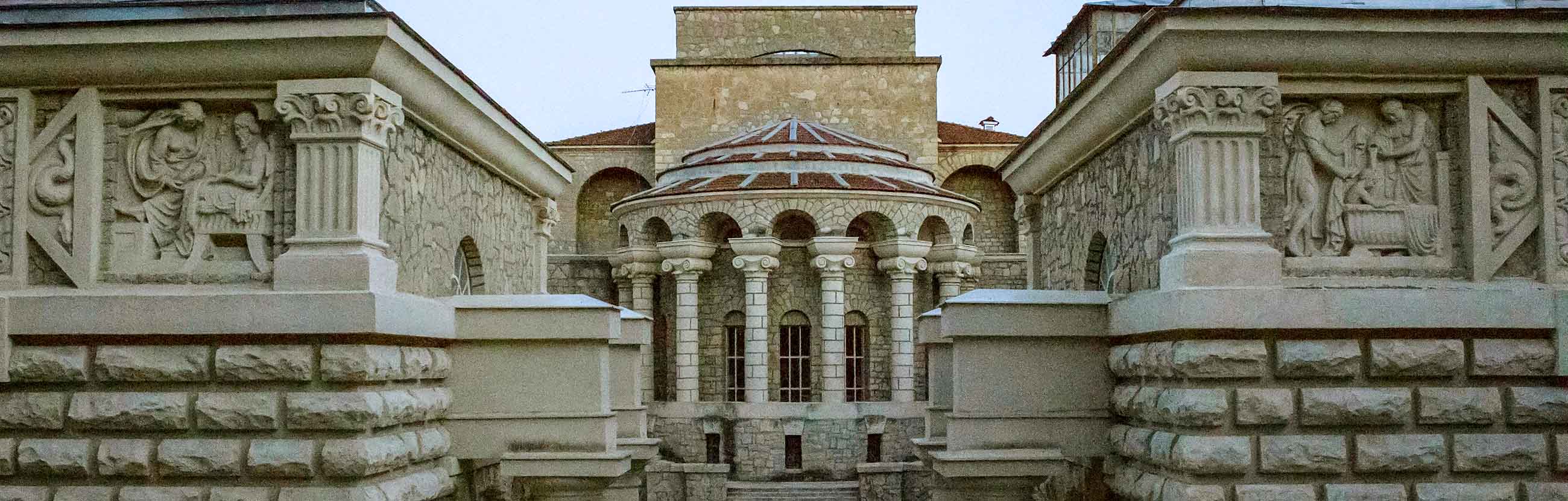 Отдыхающие фотографируются с застывшими в камне львами у подъездных пандусов. Повторяют позы богов-великанов и нимф. У каждого после посещения лечебницы есть снимок с Эскулапом. Отдельного внимания заслуживают барельефы.