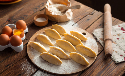 Самое любимое блюдо всех гостей Крыма! Чтобы караимские пирожки получились хрустящими и сочными, надо знать секреты. Тесто готовится по типу слоеного с добавлением тертого замороженного сливочного масла. Только к обычным ингредиентам, муке и яйцам, добавляется вода с уксусом. Начинка — куриное филе с луком. По форме караимские пирожки выглядят, как большие вареники.