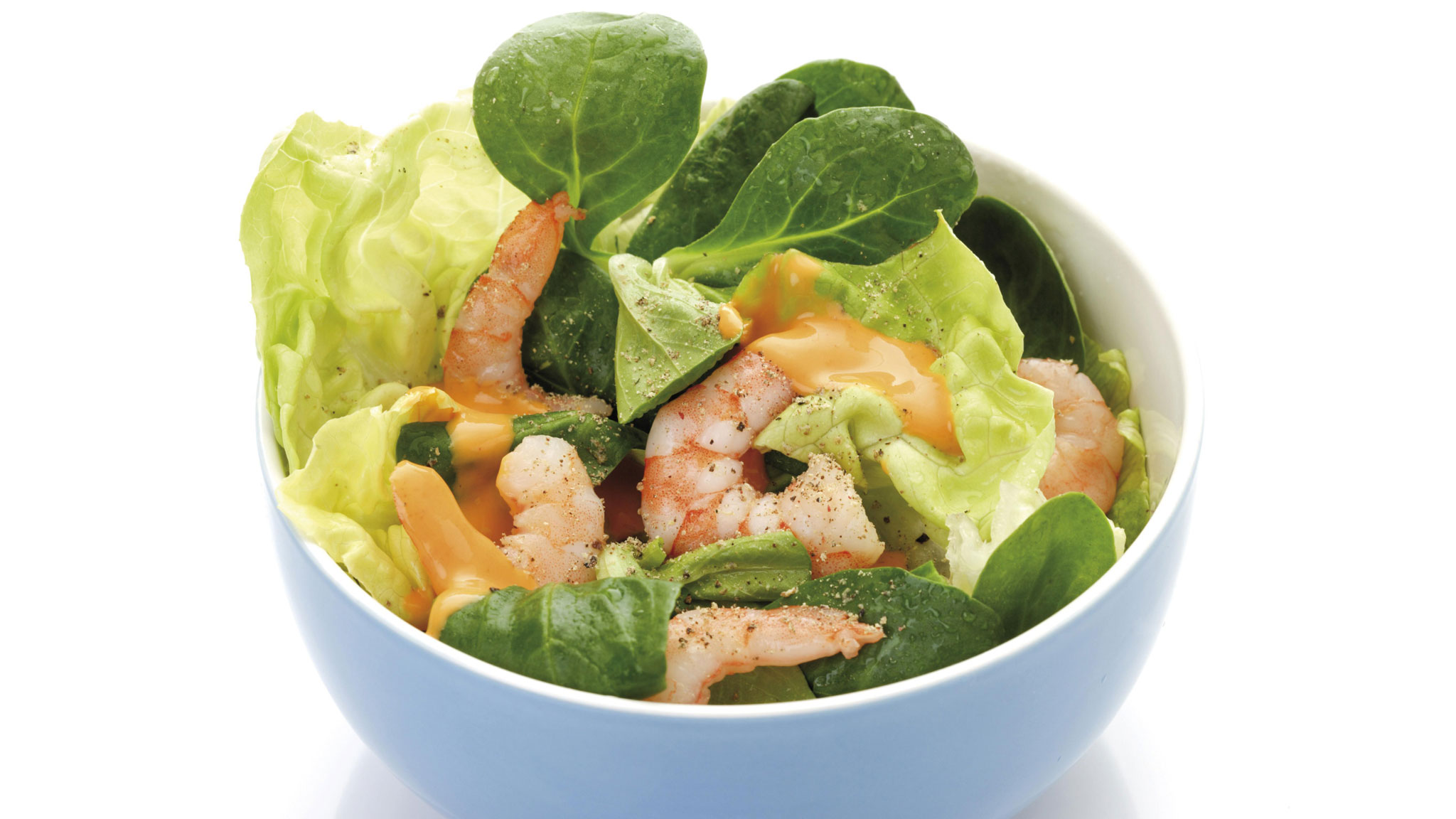 Легкий и полезный салат делается одним махом. В ход идут салатные листья, нарезанный ломтиками авокадо, помидоры черри, твердый сыр и очищенные креветки. Из зелени берут петрушку, кинзу, укроп, лук. Особый вкус добавляют кедровые орешки. В качестве заправки используют лимонный сок и оливковое масло.