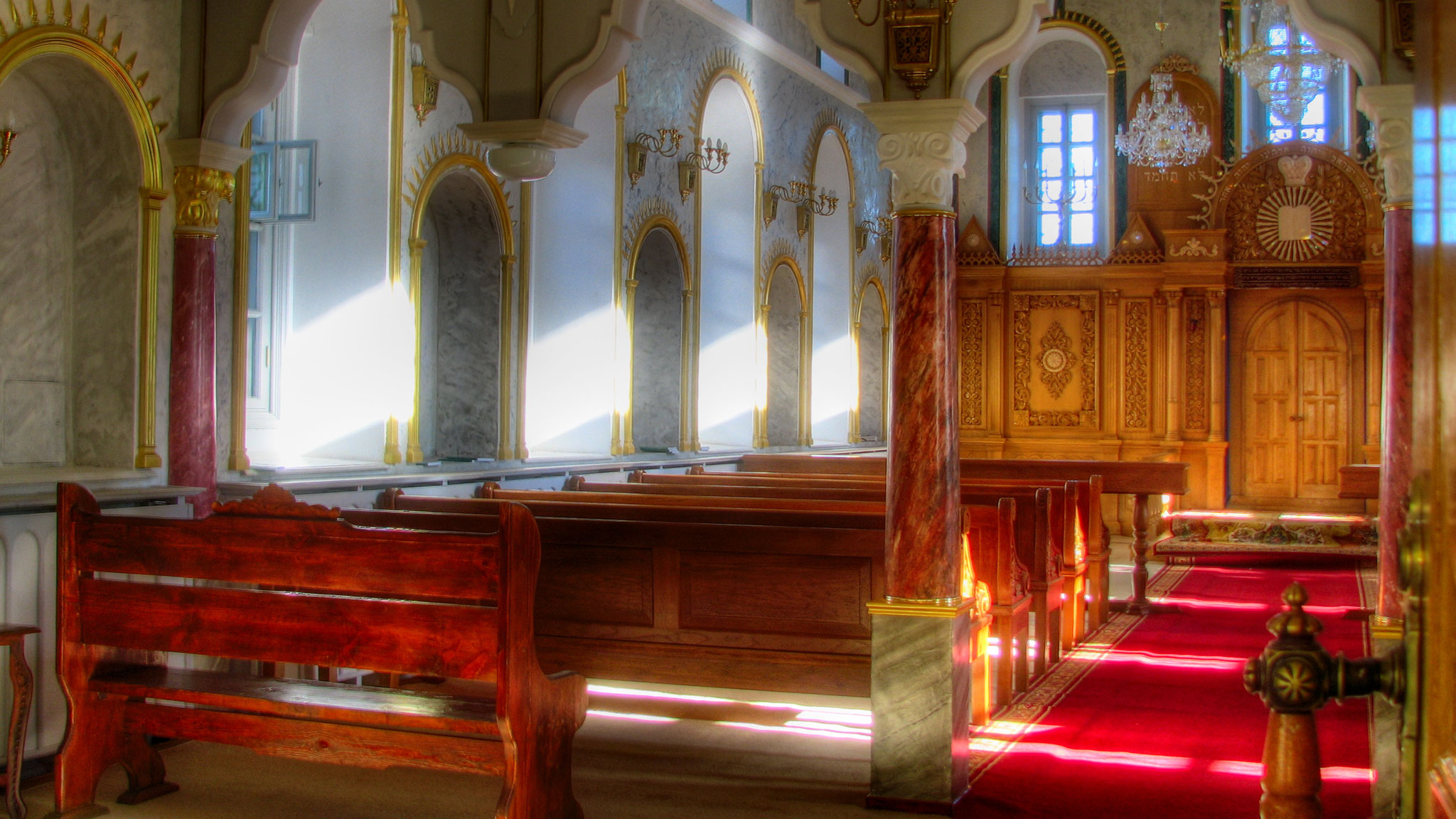 Большая кенаса помпезная и поражающая воображение. Все здесь привлекает внимание: яркие витражи, искусная резьба по дереву, шикарная вышивка. Вы увидите также древние свитки Торы — священные писания.