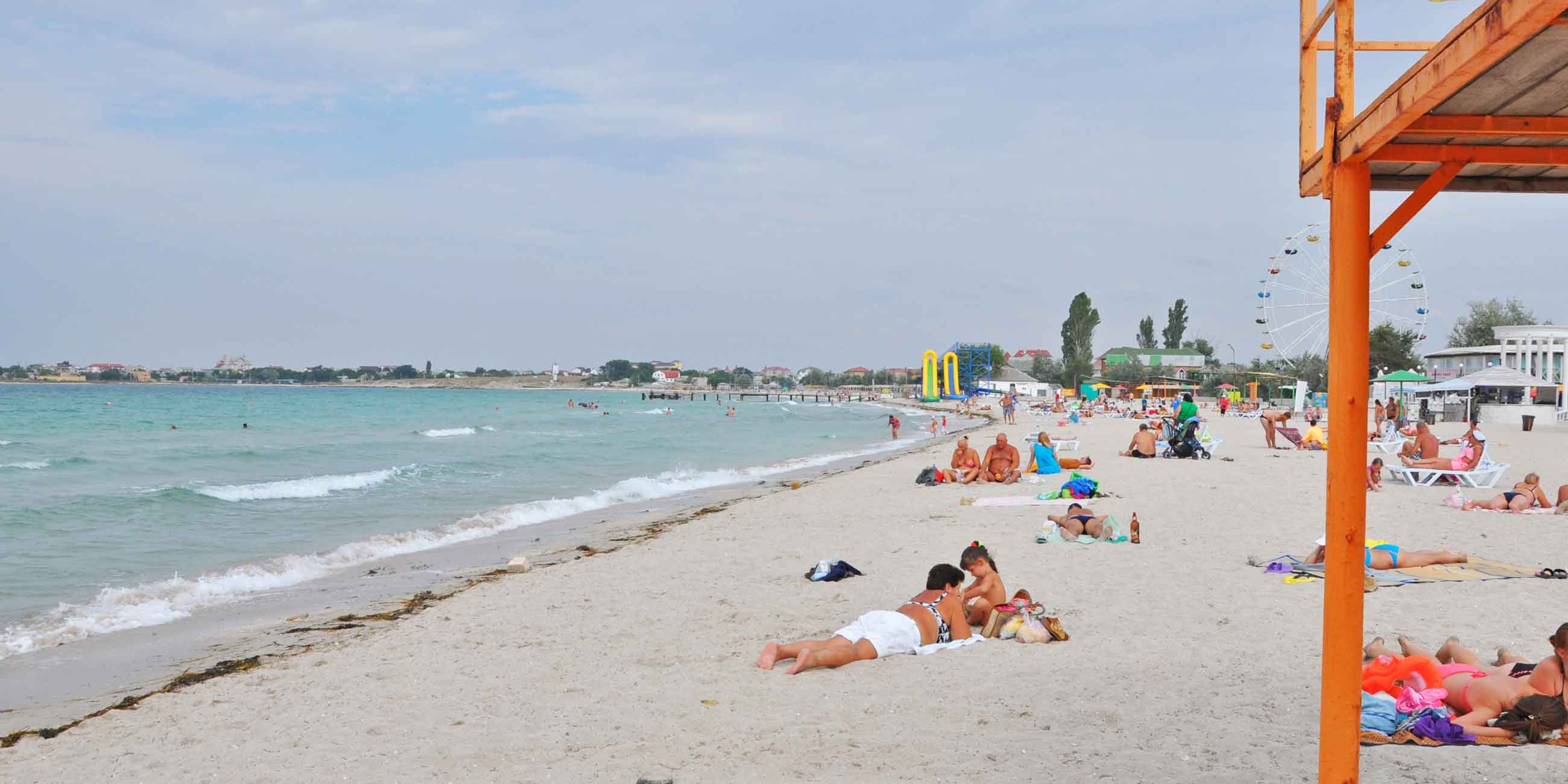 Песчаный пляж «Солярис» в Евпатории — с развитой инфраструктурой, отличное место для отдыха с детьми. Дно пологое, вода быстро прогревается, а у берега неглубоко. Хороший вариант, чтобы учить малышей плавать.