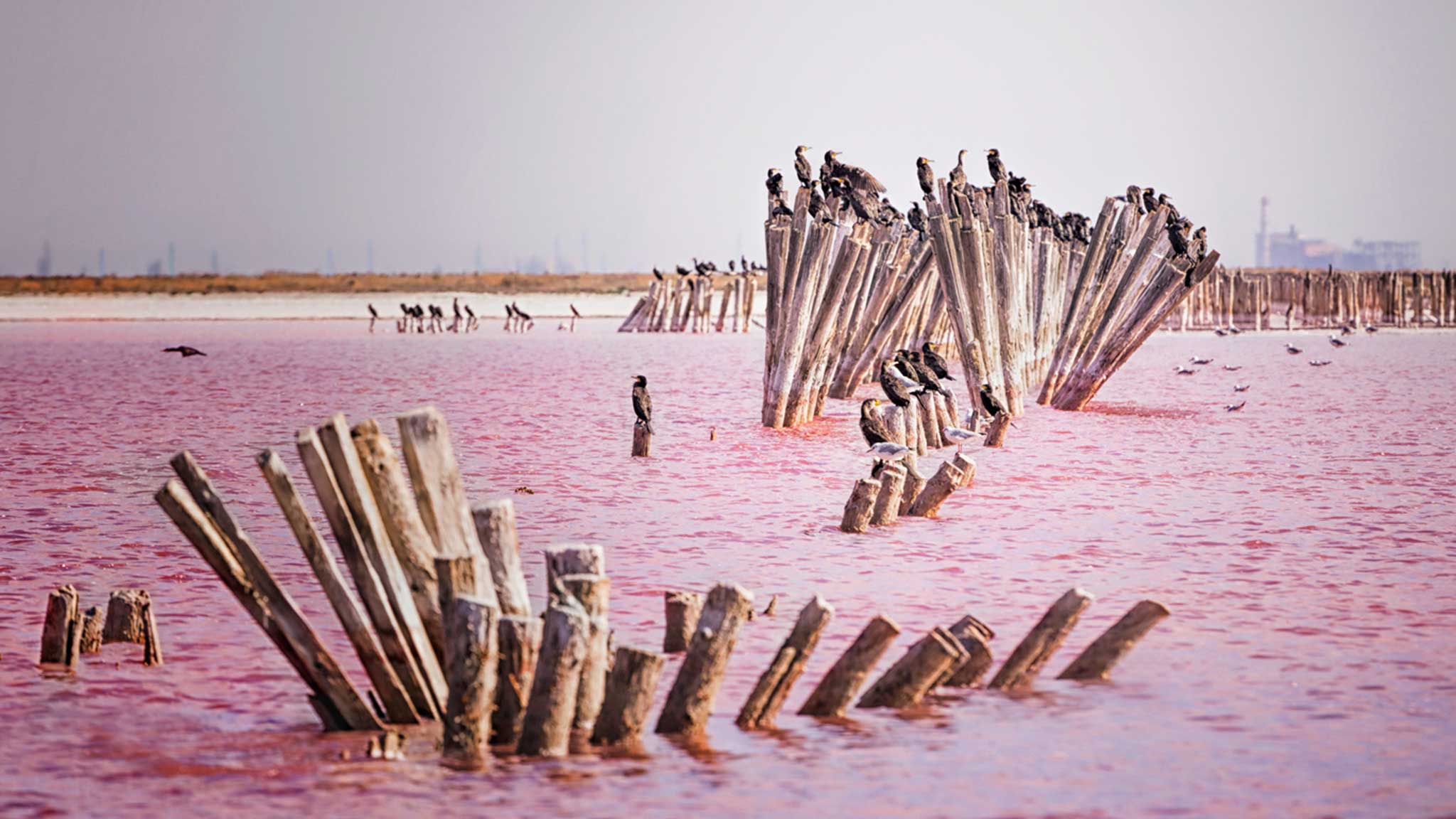Вода в этом озере, входящем в комплекс солончаков Сасык, действительно окрашена в насыщенно-розовый цвет, точно клубничный смузи. А все из-за содержащей марганец целебной соли, раствор которой в озере настолько крепкий, что местами она кристаллизуется, образуя причудливые искрящиеся на солнце друзы.