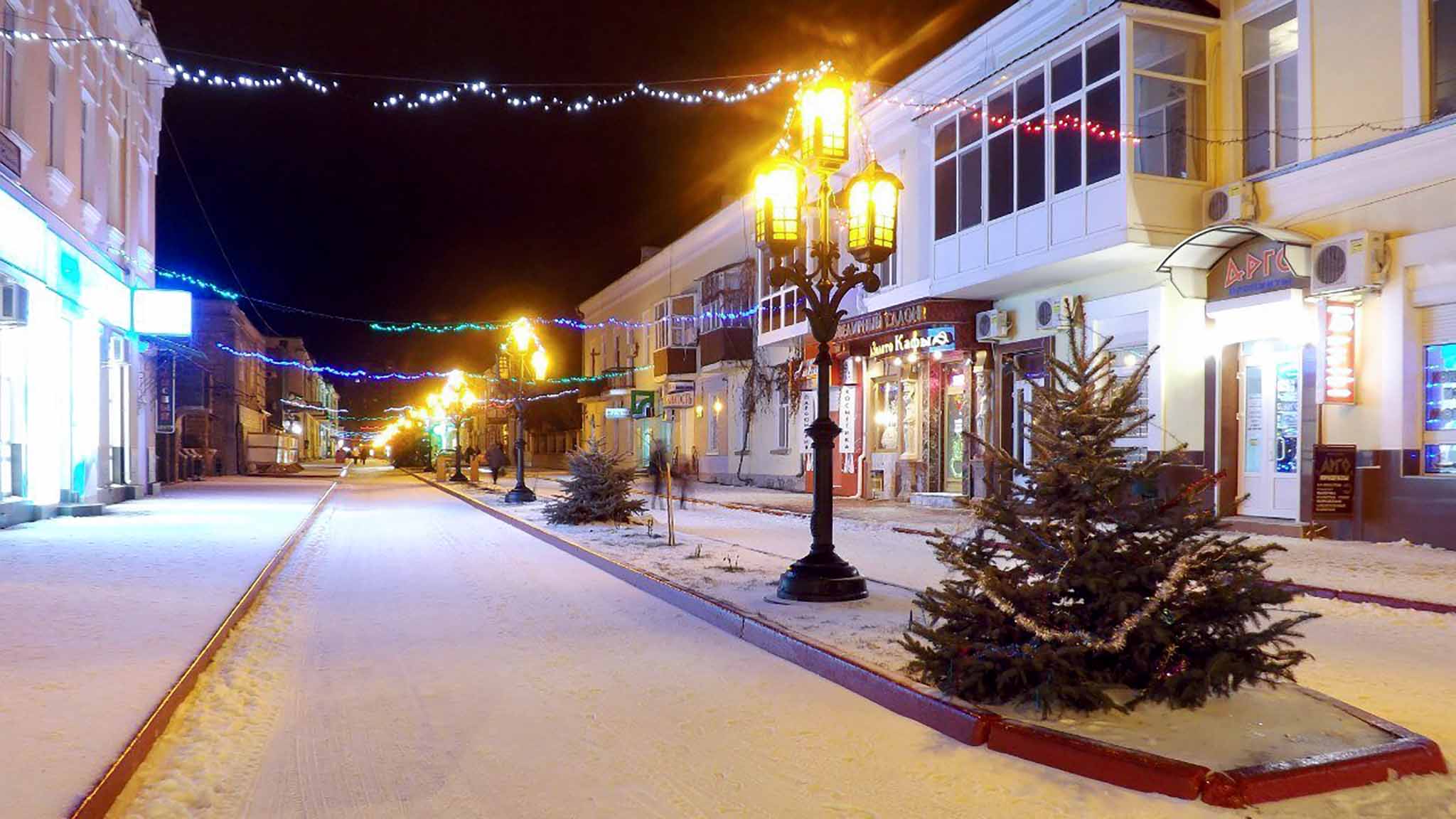 В витринах магазинов и кафе сверкают разноцветные шары, переливаются разноцветными огнями гирлянды на фонарных столбах и деревьях, а на площадях и улицах стоят нарядные елки. Причем, кое-где украшают не новомодные искусственные, а настоящие крымские сосны и ливанские кедры.