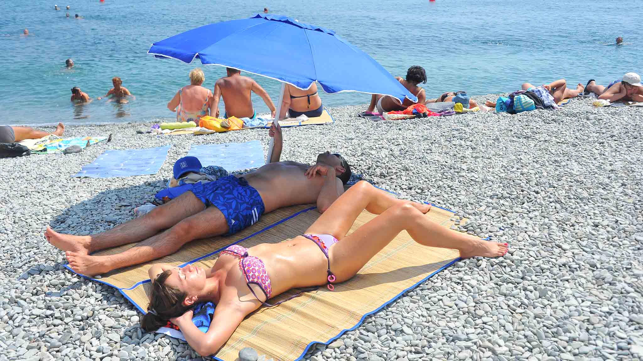 Пляжей тут немало, большинство из них оборудованы всем необходимым, покрыты крупной насыпной галькой, а некоторые песком. Заход в воду удобный, без крупных камней, дно понижается довольно круто, так что те, кто не умеет плавать, могут плескаться лишь у самого берега.