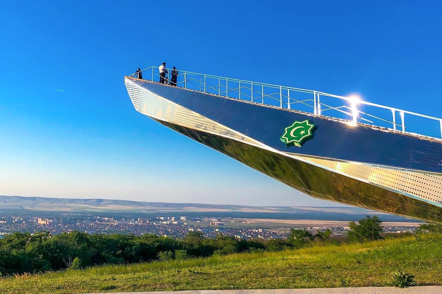 Смотровая площадка на окраине Грозного издали напоминает вырывающийся из-под земли корабль, по которому можно подняться куда-то в облака. Это место благоустроили несколько лет назад на пологом склоне, откуда открывается панорамный вид на город и окрестности. А на горизонте просматриваются силуэты Кавказских гор. Это место называют «Лестницей в небеса».