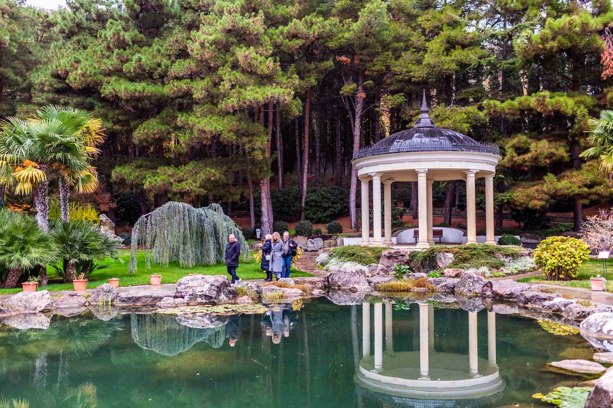 Этот красивейший парк Крыма открылся в 2007 году. Античные статуи – копии мировых шедевров, мраморные колоннады, ротонды, белокаменные, выложенные мозаикой лестницы, экзотические растения, смотровые площадки, живописные озера и даже традиционный японский сад – все это прекрасно в любое время года.