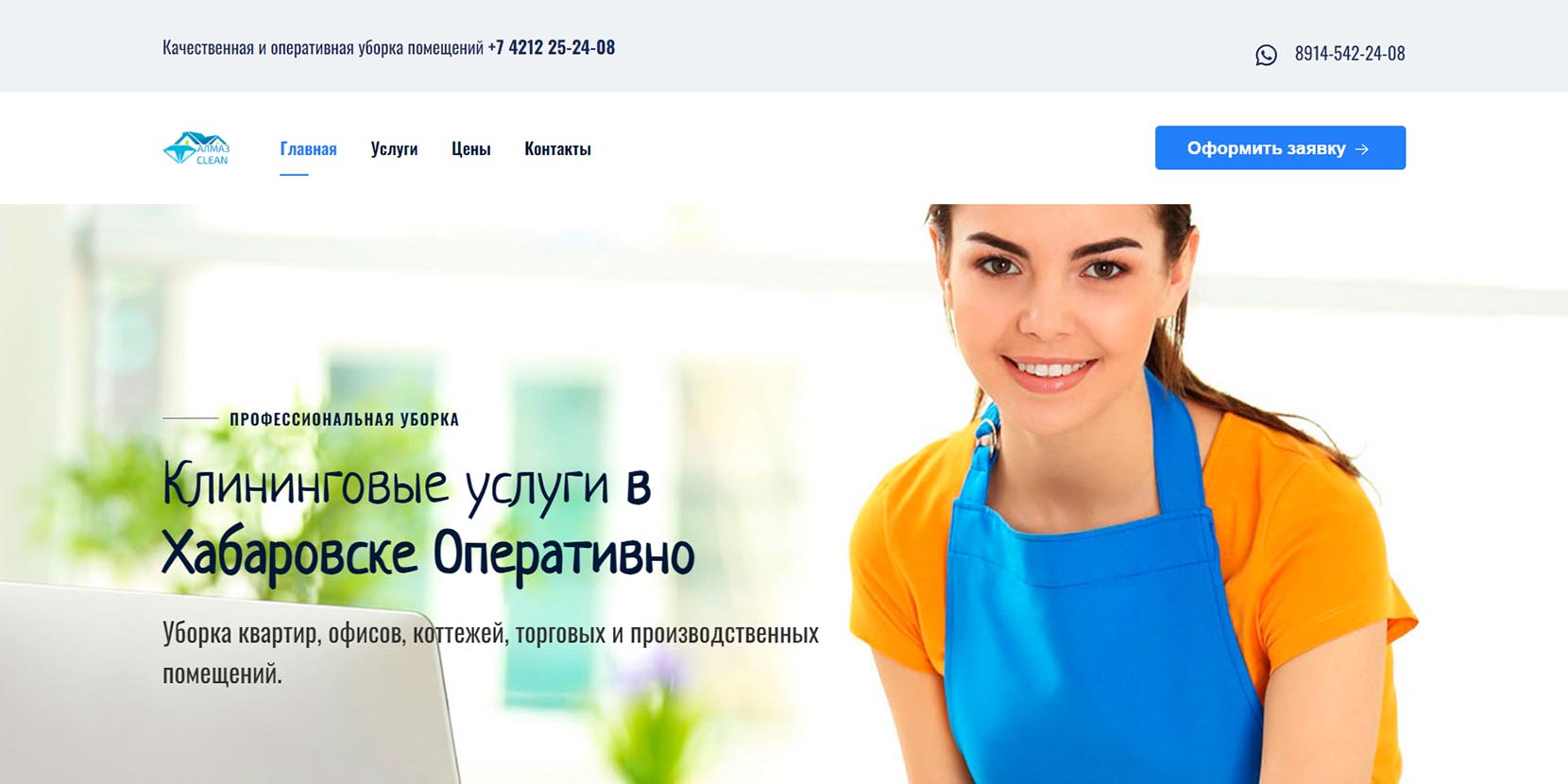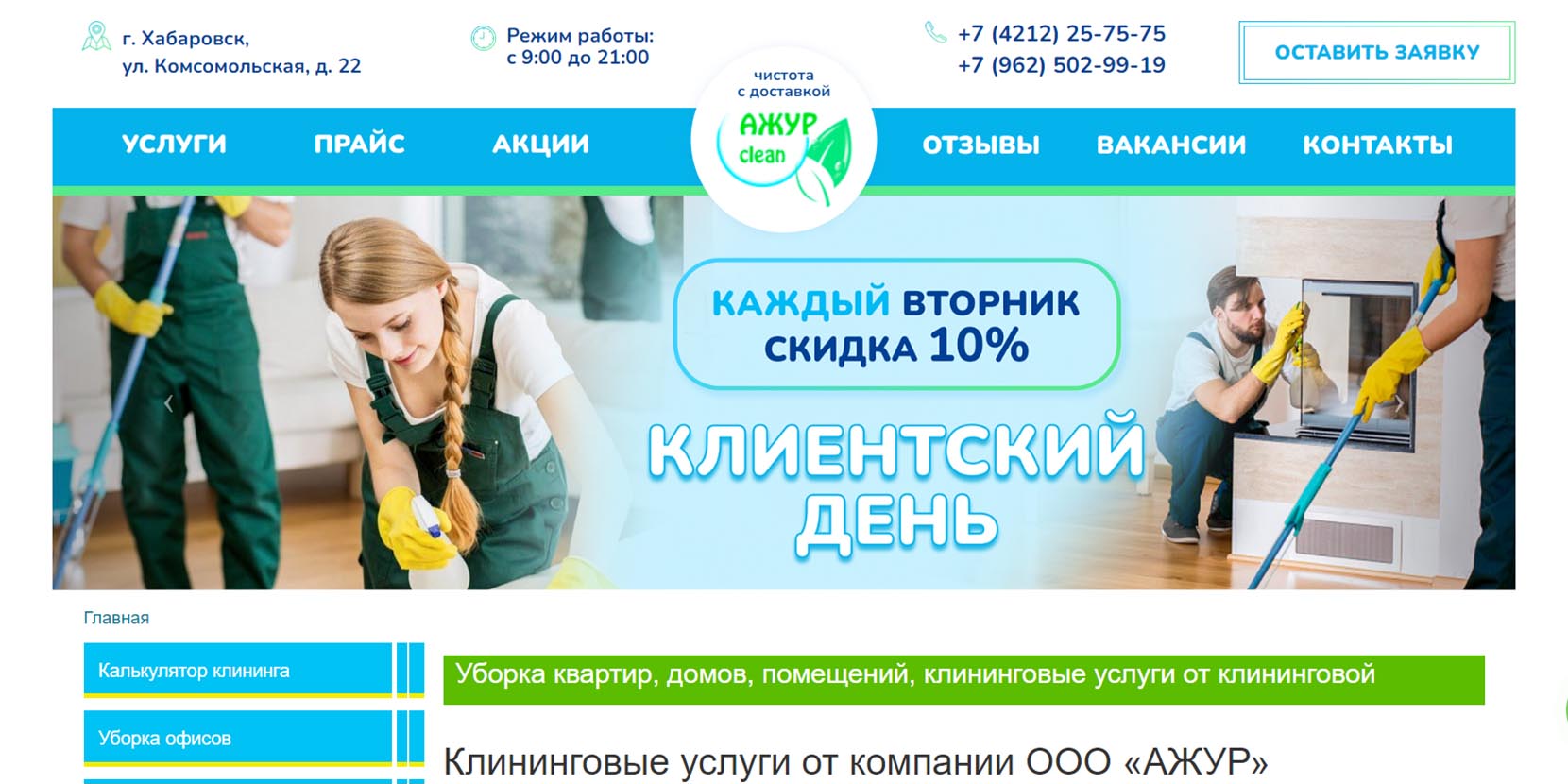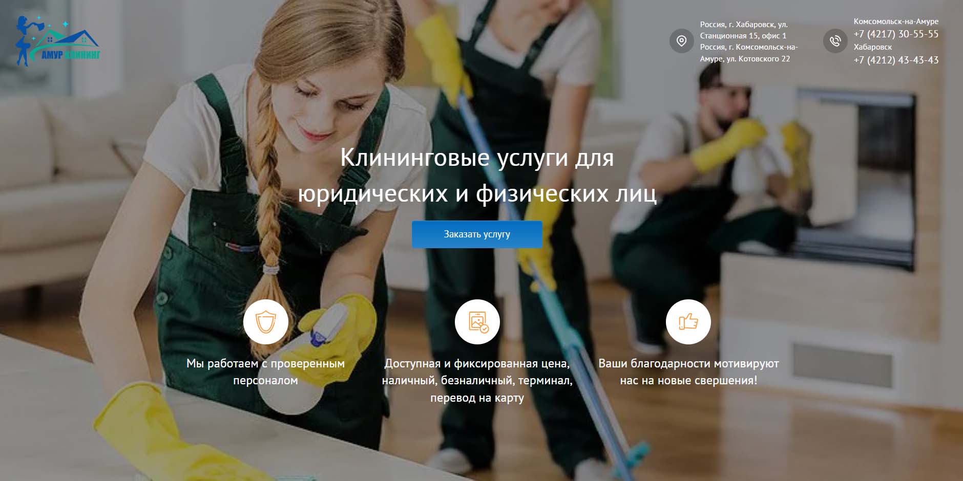 Клининговая организация ведет свою деятельность в двух городах региона — Хабаровске и Комсомольске-на-Амуре. Отмечают, что работают только с проверенным персоналом. Оказывают услуги юридическим и физическим лицам. Ежедневно убирают около 60 тыс. квадратных метров площади — квартиры, офисы, торговые центры, рестораны, аптеки, складские и промышленные помещения. Предлагают генеральную уборку после ремонта, выездную химчистку мебели, ковров и ковровых покрытий, мойку окон, уборку прилегающих территорий и рекламных конструкций