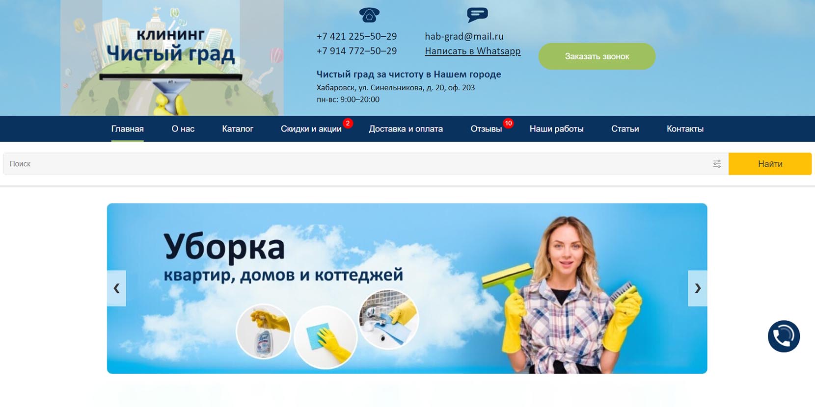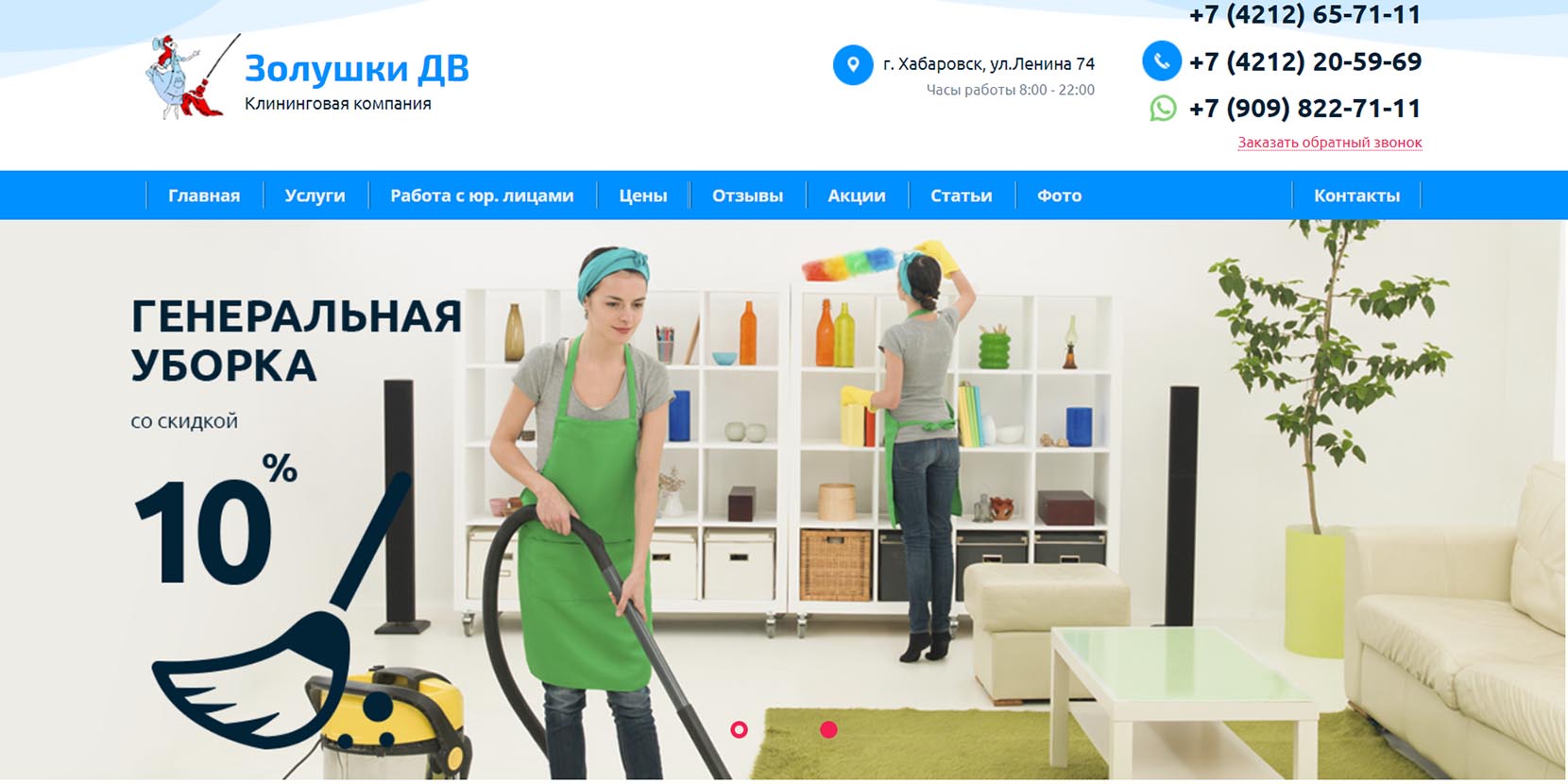 Предоставляют клининговые услуги в Хабаровске с 2009 года. Специалисты применяют профессиональное оборудование (парогенераторы, пылесосы со множеством насадок и другое) и сертифицированные материалы, отвечающие нормам безопасности. Помимо наведения порядка в помещениях, предлагается уборка снега и мусора (с вывозом и без), ландшафтные работы и озеленение, покос травы и стрижка газона, очистка крыши, уборка прилегающих территорий и услуги дворника.