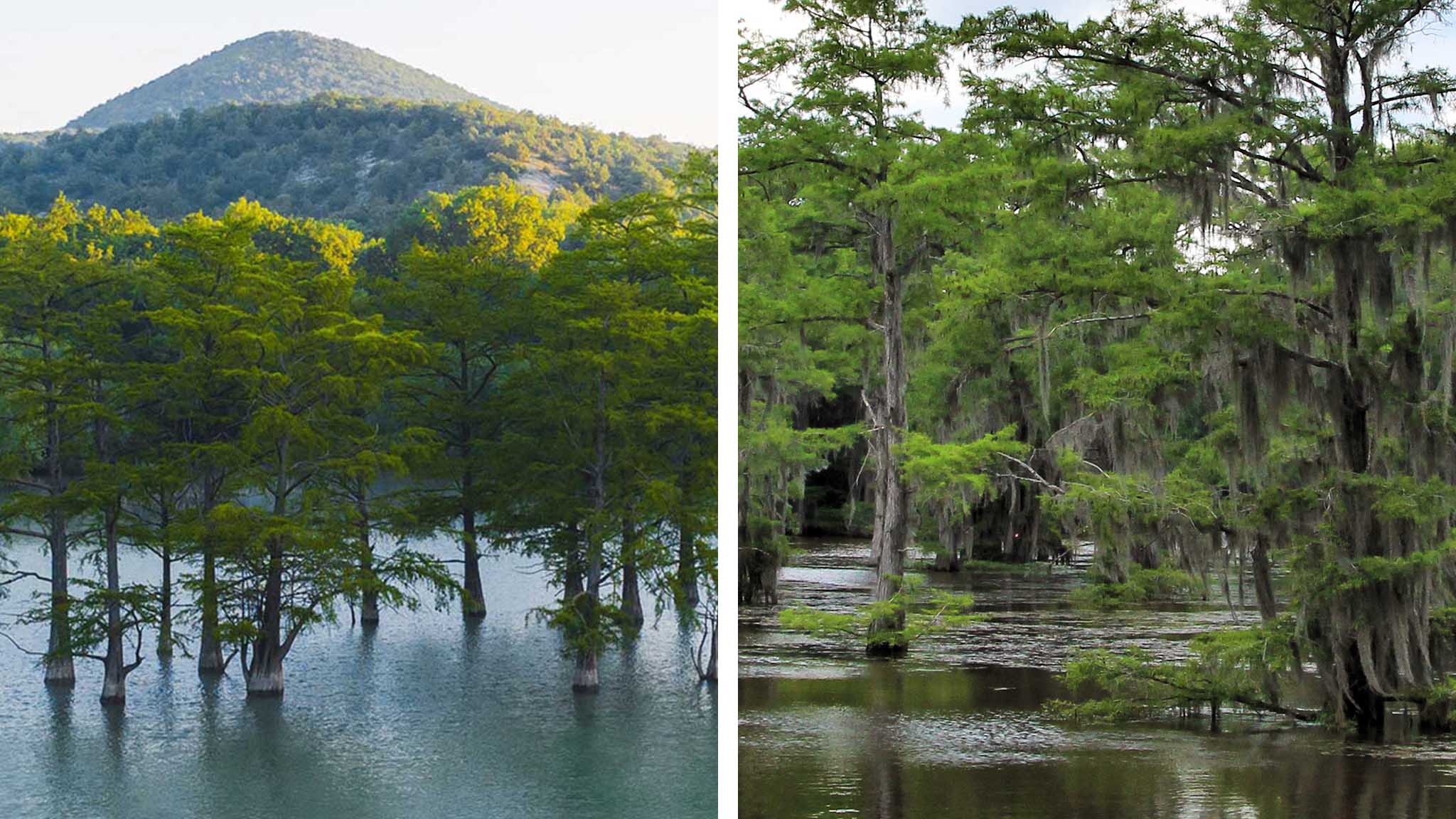 На озере Каддо в США прямо из воды растут 50-метровые болотные кипарисы. Они покрыты нитями испанского мха. Здесь снимали фильм ужасов «Челюсти 3D». Каддо занимает площадь больше 100 кв. м, там растут почти 200 видов деревьев и обитают множество птиц и животных. Даже аллигаторы.