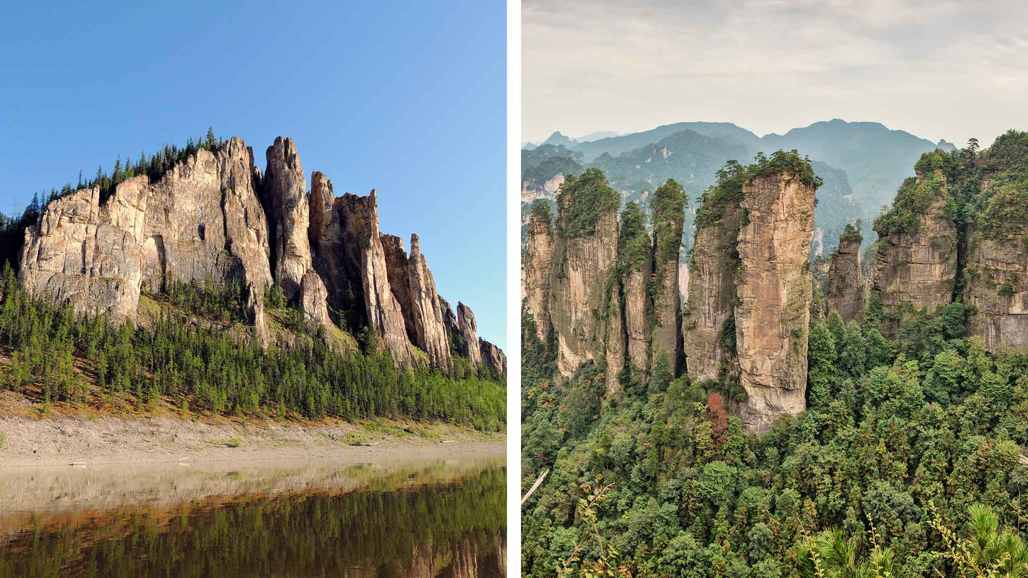 На берегу реки Лены в Якутии находится национальный заповедник протяженностью 40 км. Тысячи вытянутых вверх скальных образований, высота которых доходит до 100 м, завораживают своим видом. У Ленских столбов вид не менее фантастический, чем у китайских колонн. Каменные великаны на реке Лена сложены из пород, которым около 550 миллионов лет. Стена из известняковых скал тянется вдоль реки Лены почти на 70 км. Высота — 200−300 метров. Прогуливаясь по берегу, можно найти отлично сохранившуюся наскальную живопись. Изображения животных, людей, какие-то загадочные символы, нарисованные красной и желтой краской. Для геологов Ленские столбы — настоящая находка. Среди этих скал находят множество редких окаменелостей вымерших животных.
