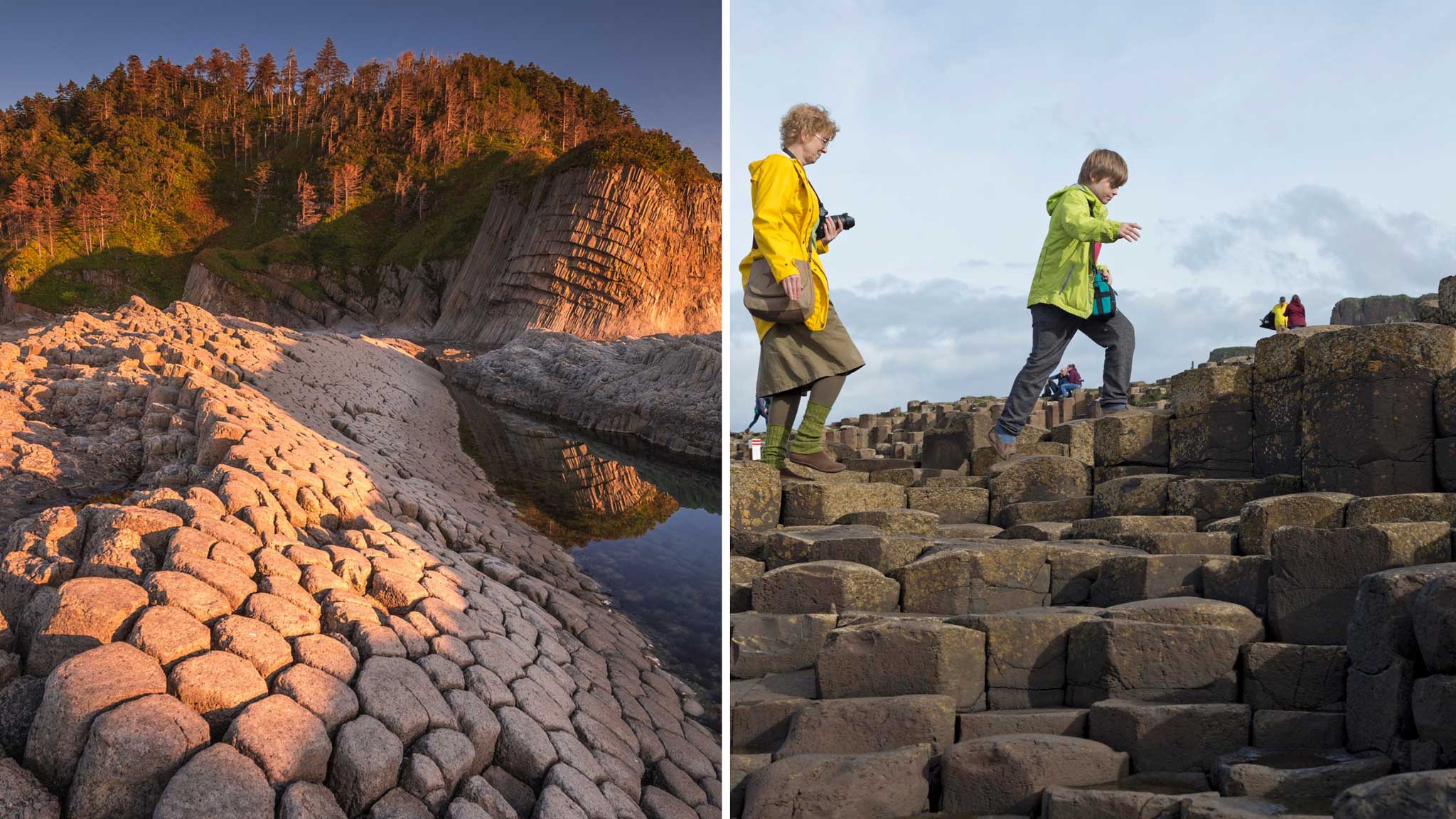 Одна из главных достопримечательностей Северной Ирландии — Дорога гигантов, или Тропа великанов. Она тянется вдоль побережья 275 метров, а потом плавно спускается в Атлантический океан. За 60 млн. лет тропа почти не пострадала, между ее «ступенями» до сих пор почти невозможно просунуть лезвие ножа, настолько близко они примыкают друг к другу. В пяти километрах на северо-восток от деревушки Бушмилс в море уходят базальтовые колонны: 40 тысяч каменных столбов диаметром 30-50 см и высотой 6-12 метров. Ирландцы поговаривают, что их вбил местный герой-богатырь Финн Маккул. Он хотел сразиться с соперником Голлом, не замочив ног, поэтому построил мост. На самом деле колонны появились, когда лава древнего вулкана растрескалась в холодной воде.