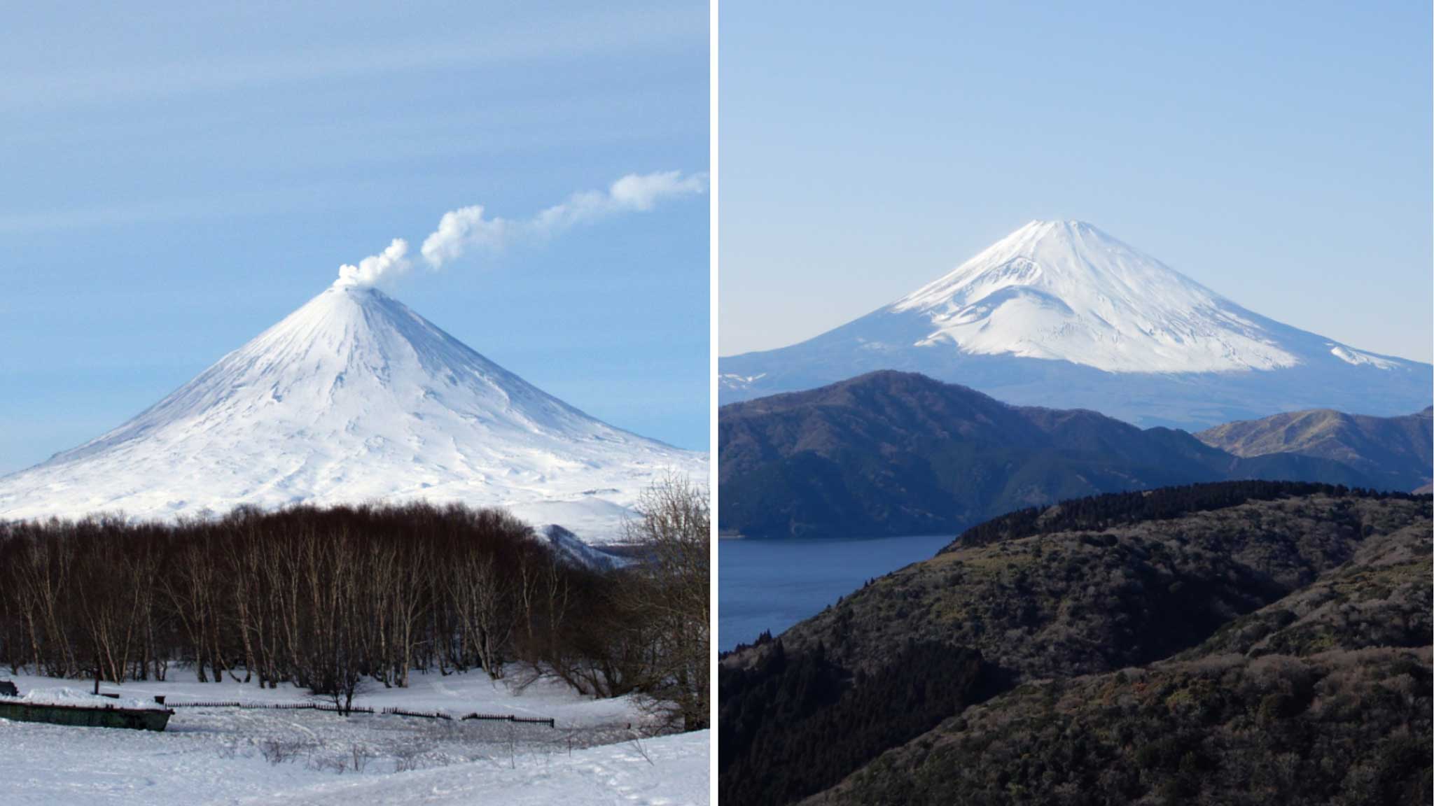 Вулканы Ключевская Сопка и Фудзияма называют близнецами. Оба действующие и в форме правильного конуса. Разница лишь в том, что Ключевская Сопка на целый километр выше японского собрата и к тому же активнее. Вулкан Фудзияма — самая высокая гора в Стране восходящего солнца (3700 м). Он извергался последний раз в начале XVIII века.