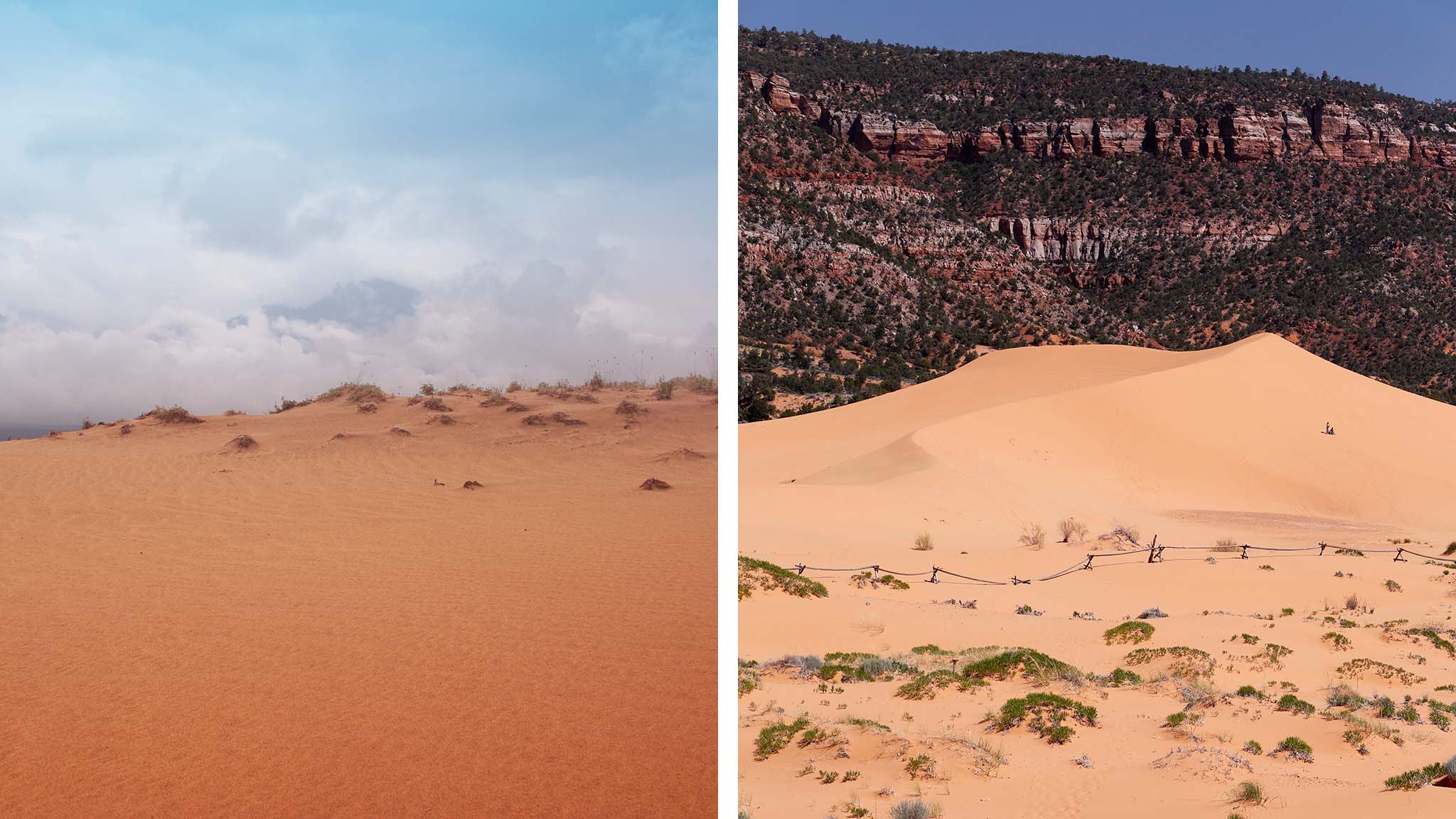 В национальном парке штата Юта на западе США главная достопримечательность — дюны из кораллово-розового песка. Дюнам 15 тысяч лет. Они перемещаются между скалами. Выветривание пород, богатых минералами и оксидами железа, как раз и рождает необычный песок.