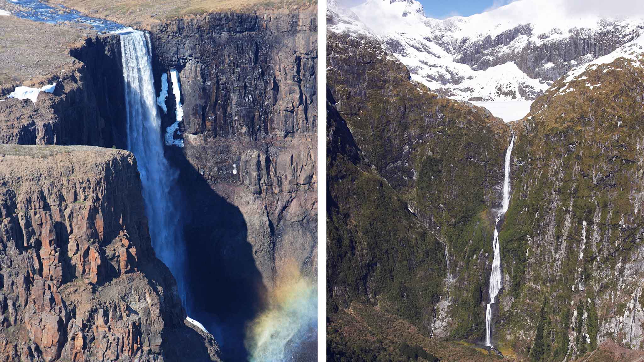 Новозеландский водопад Сатерленд — это 580-метровый столб воды, питающийся тающими ледниками и ручьями, спускающимися в чашу горного озера.