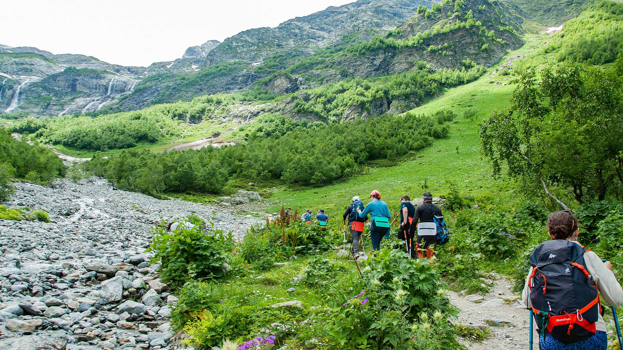 Летний Домбай открывает туристам много прекрасных мест, на которые сложно попасть зимой. Здесь потрясающие виды со всех сторон: ледниковые озера, бурный поток горных рек, шумные водопады, альпийские луга, темнохвойные леса и сверкающие снежные пики. Все эти природные объекты расположены в известных горных ущельях Алибек, Аманауз, Домбай-Ульген и Гоначхир.