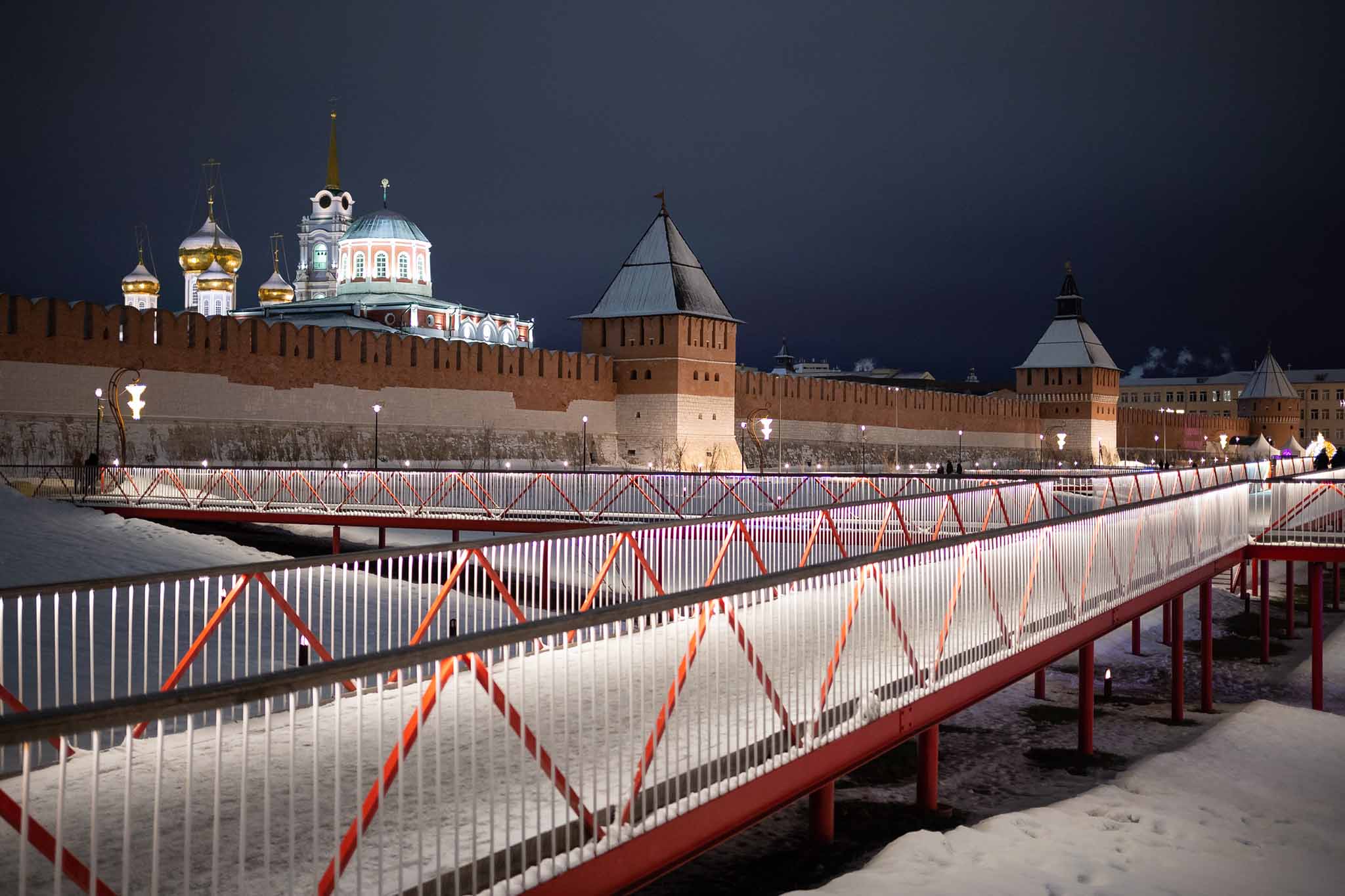 «Пряничный город» расположен в 183 км к югу от Москвы. До него можно доехать по Симферопольскому шоссе (трасса М-2). В зимнем городе рекомендуем посетить Тульский кремль — его красные кирпичные стены выделяются на фоне заснеженного белого пространства вокруг. Зимой проход на стены закрыт, но вечером их украшают праздничные огни.