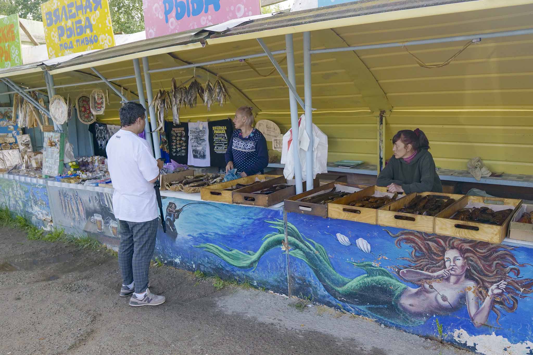 С рыбным репертуаром Селигера знакомимся на въезде в Осташков. Некоторые торговки божатся, что вся линейка горячего копчения — исключительно местная. Но это не так. Например, сома и угря (продают не на вес, а поштучно) здесь нет. Зато по-прежнему много леща, сига, линя, щуки. Мы взяли на пробу судака (вытянул на 600 рэ) и он был просто божественен!