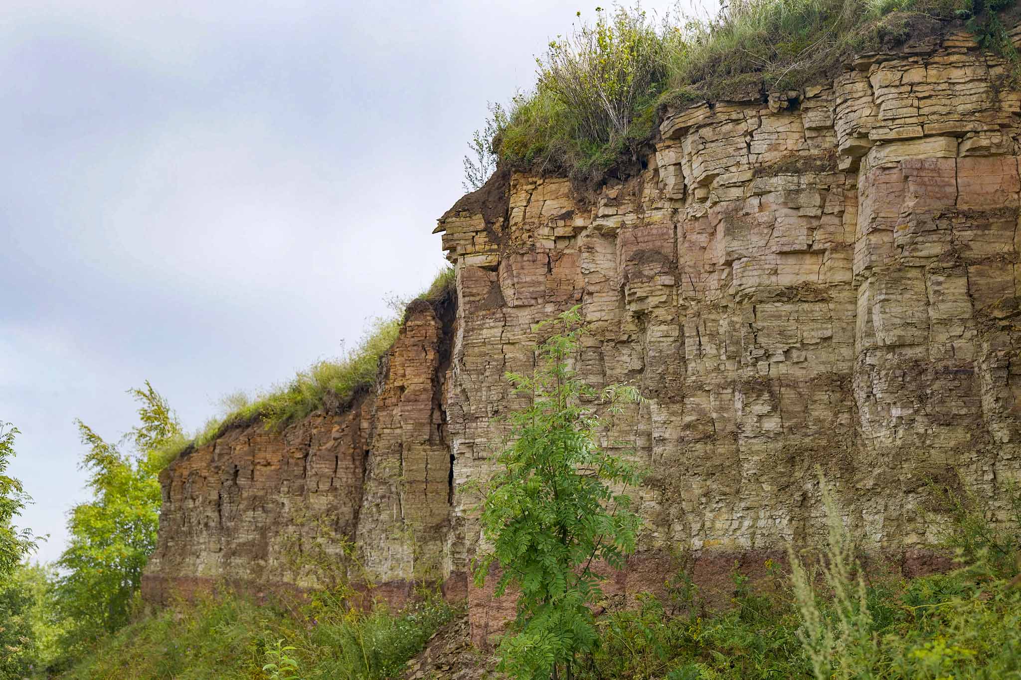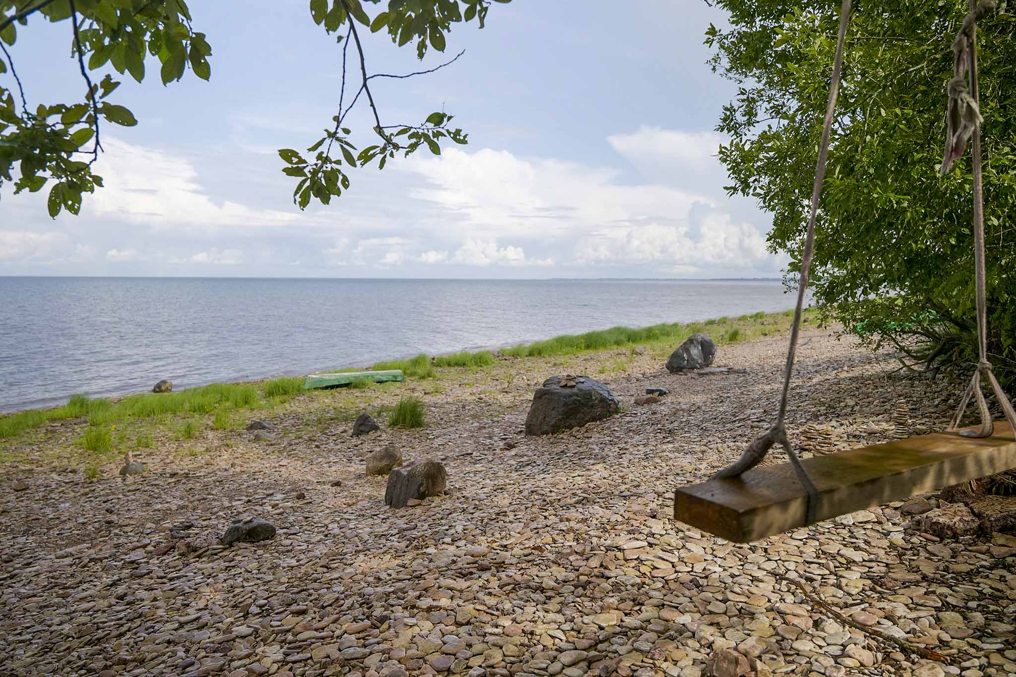 Собственно, ради этого вида именно в Ретлё и едут — здешнее плато это так называемый Ильменский глинт, скалы с резким срезом породы, похожей на слоеный пирог. Спускаемся по лестнице к воде. Полоска крупных камней, между которыми вспышки изумрудной травы, у самой кромки — песок. Хочется часами неспешно чесать вдоль воды — под музыку волн, музыку ветра. Говорят, в разбросанных по берегу камнях часто находят окаменелости. Вот и нам попался отпечаток домика древней улитки…