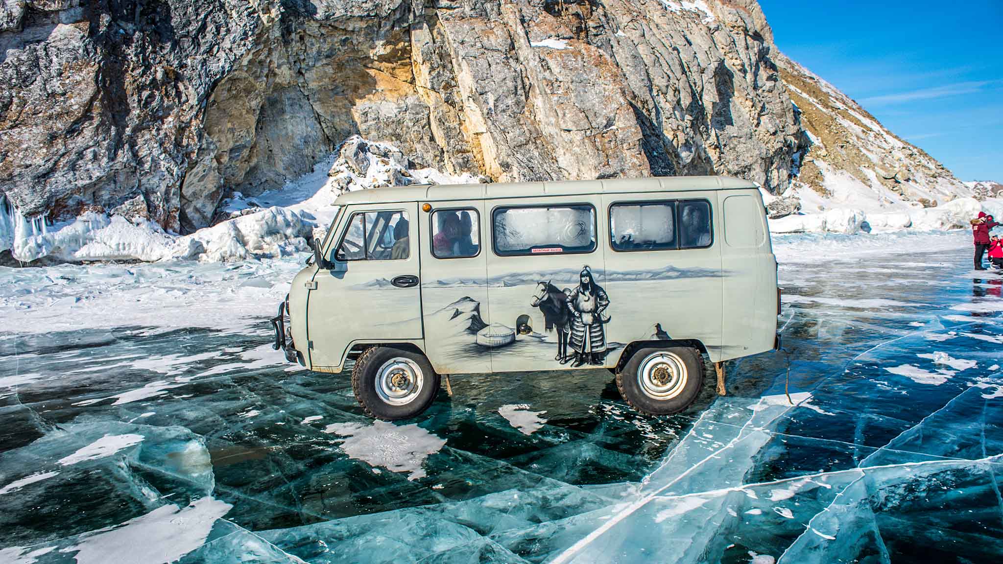 Вы точно удивитесь, заприметив на кристальном льду дорожные знаки и элементы разметки – в зимний период водная гладь до Ольхона становится ледовой переправой и официальной трассой МЧС. Будьте готовы, что понадобится 4-5 часов, чтобы добраться из Иркутска до главного поселка Ольхонского района — Хужира.