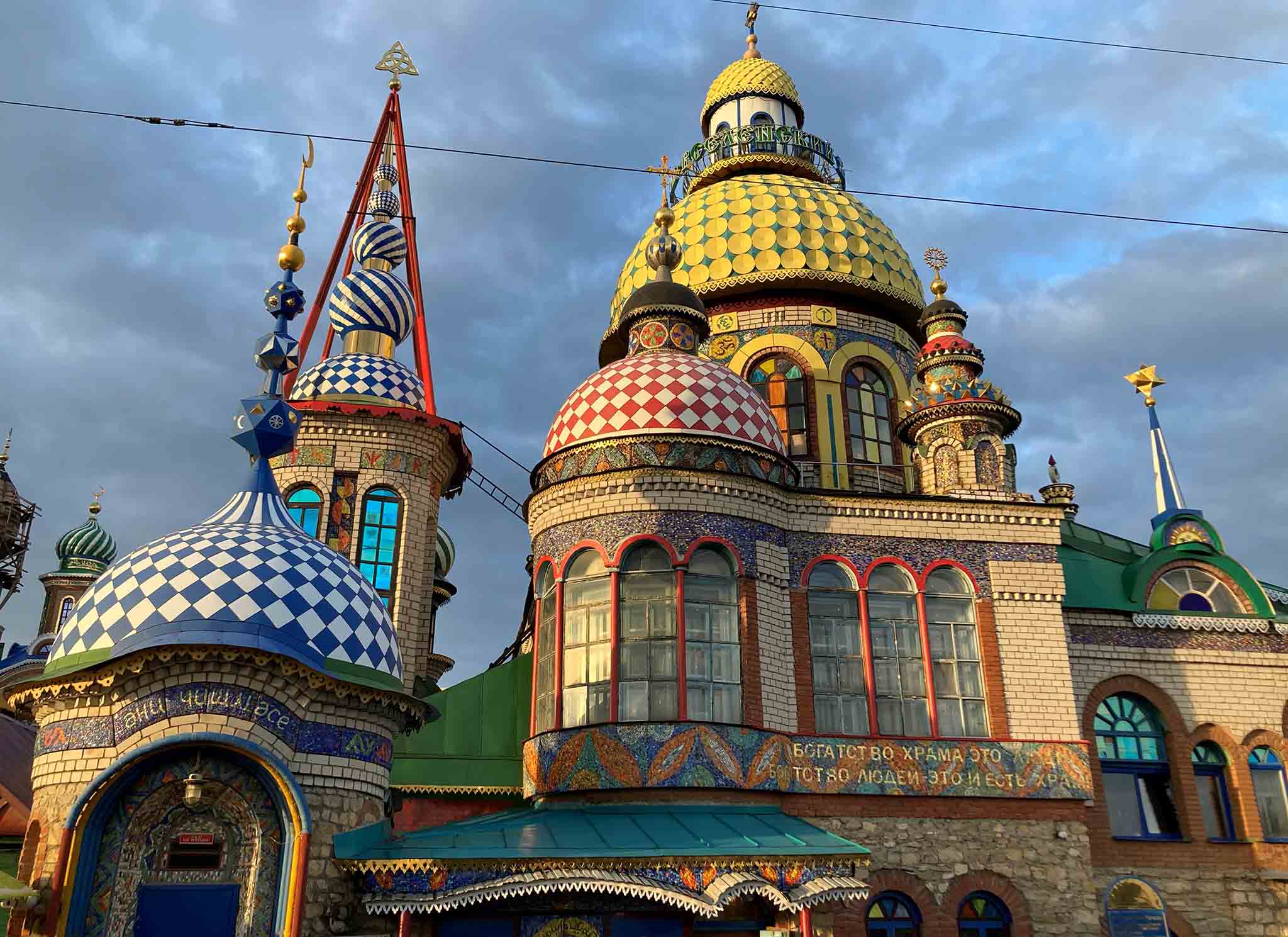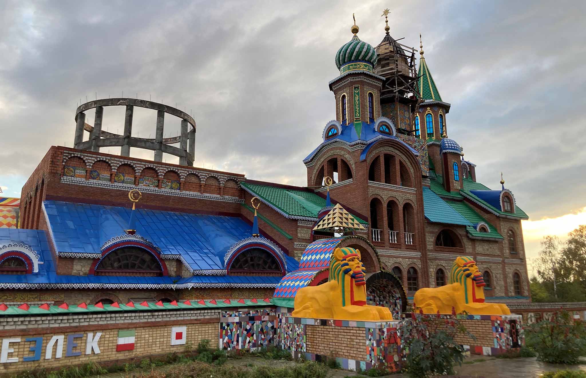 Амбициозный творческий проект, не имеющий аналогов в мире — Международный центр духовного единения, или, как его еще называют, Храм всех религий. Идея принадлежит художнику и скульптору Ильдару Ханову, который в начале 90-х начал возводить грандиозное сооружение прямо на своем участке, пристраивая новые помещения и этажи к дому, в котором родился. Частично Вселенский храм остается жилым и поныне — в той части сооружения, которая когда-то была изначальным домом, живет брат Ильдара Ильгиз — художник и иконописец, взявшийся продолжить дело брата после смерти того в 2013 году. Поэтому, если вам повезет, во время осмотра храма вы сможете познакомиться с нынешним творцом проекта.