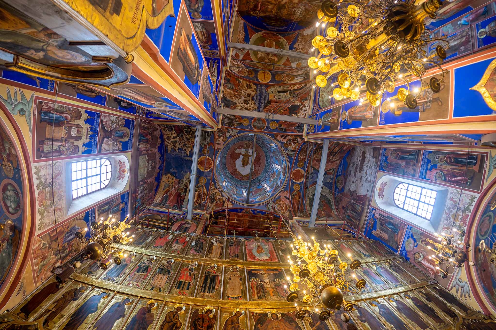 А душа успокоится в стоящем рядом Спасо-Преображенском соборе, который в XVII веке расписывал очень известный — почти как Рублев — иконописец Гурий Никитин (его фрески в том числе украшают Архангельский собор Московского Кремля).