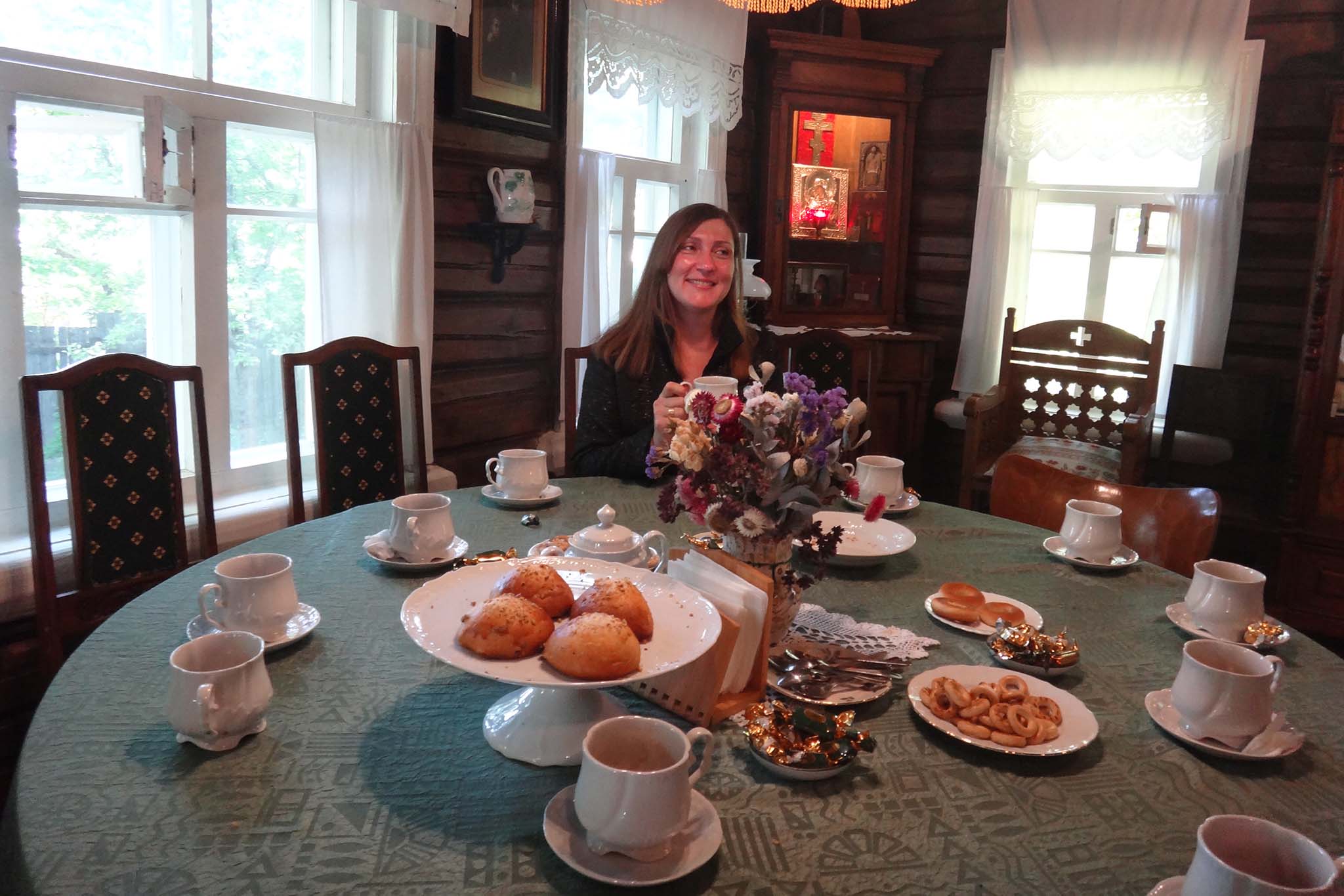 Через дорогу от монастыря (сначала вниз под горку, потом вверх) — «Дом урядника». Хозяйка Даша Парсаданова (платье в пол, фигурка Дюймовочки) усаживает гостей за стол с колобушками (от слова «колобок»). Это булочки дивной вкусноты, которые с утра напекли в монастыре.
