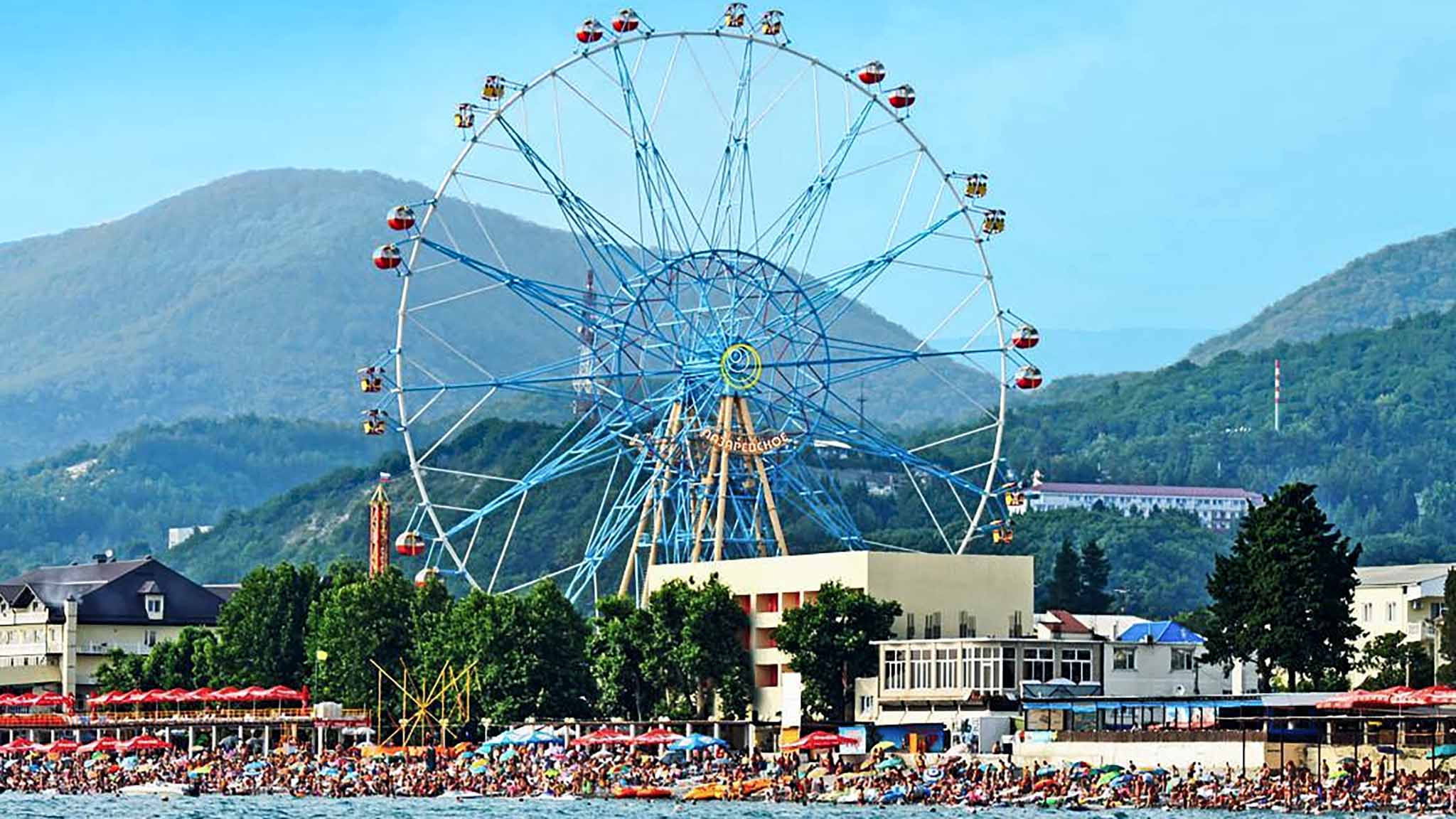 После обеда иду на пляж. Первое, что бросается в глаза, это колесо обозрения. Его сложно не заметить. Это самое высокое колесо в России, высота его 83,5 метров, 28 кабинок, половина из которых открытые. Прокатиться на таком аттракционе можно за 600 рублей. Находится колесо обозрения в парке культуры и отдыха, в самом центре курорта. А рядом с парком как раз пляж. Пока температура воды еще не такая приятная, чтобы купаться, но некоторые «моржи» все же лезут в море.