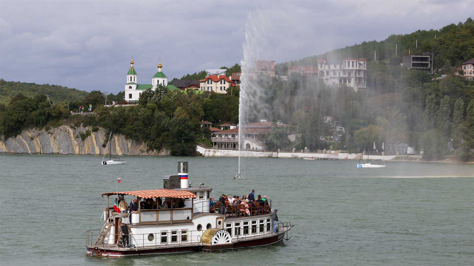 На мой взгляд, вечерний маршрут стоит выбирать путешественникам, которые уже были в Абрау-Дюрсо. Для тех, кто тут впервые, лучше отправиться на дневную прогулку по озеру. Так удастся лучше познакомиться с окрестностями, посмотреть на белоснежную набережную с величественной ротондой, где часто выступают артисты. А еще с середины озера разглядеть церквушку, свисающую прямо со скалы.