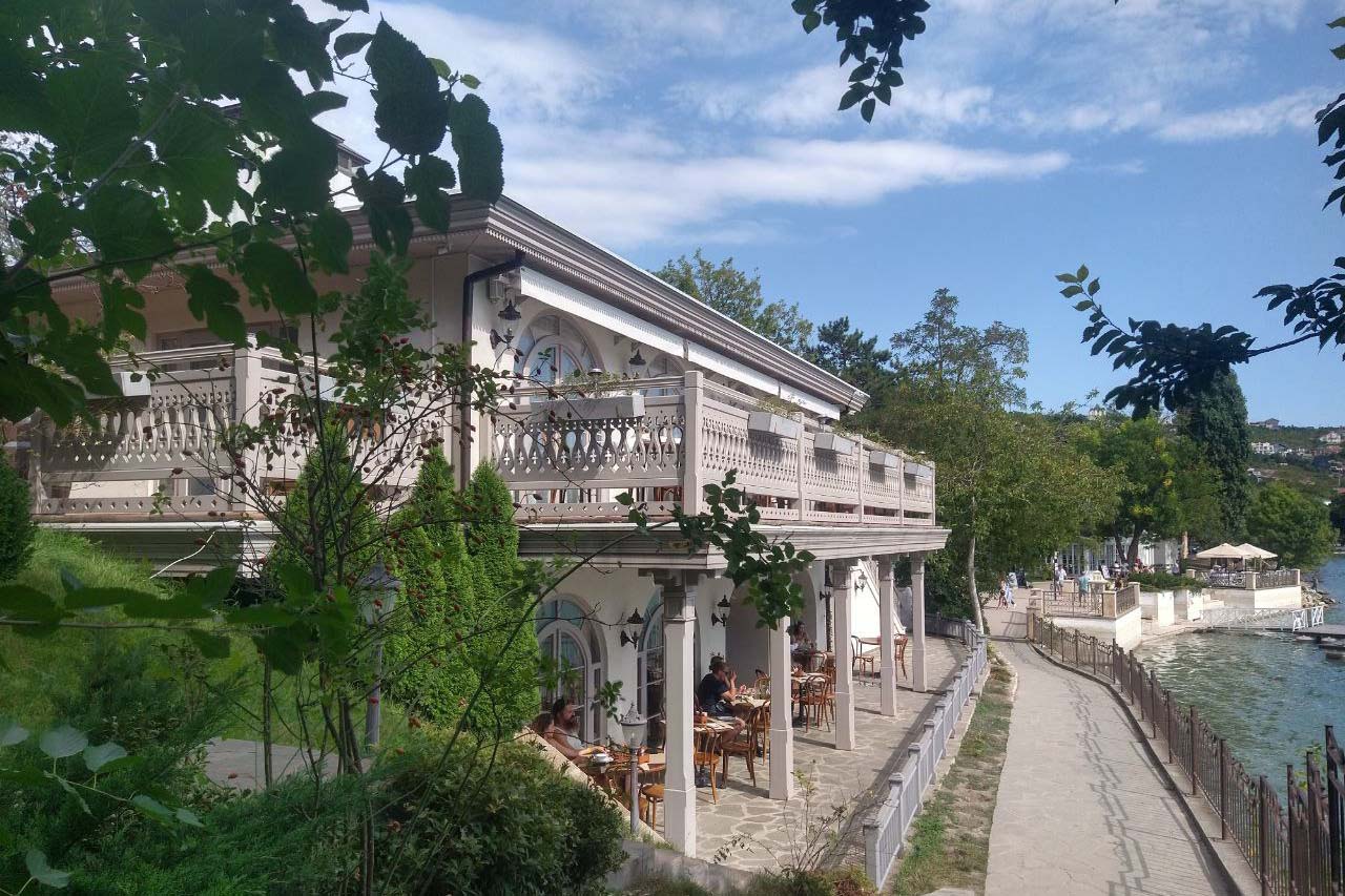 Подкрепиться после прогулки по озеру можно в любом из кафе на берегу. Не смогла пройти мимо двухэтажного белого ресторана с огромной верандой — искать что-то больше уже просто не захотелось. Уж слишком красивое заведение на вид. Такие еще рисуют художники, изображая французский Прованс.