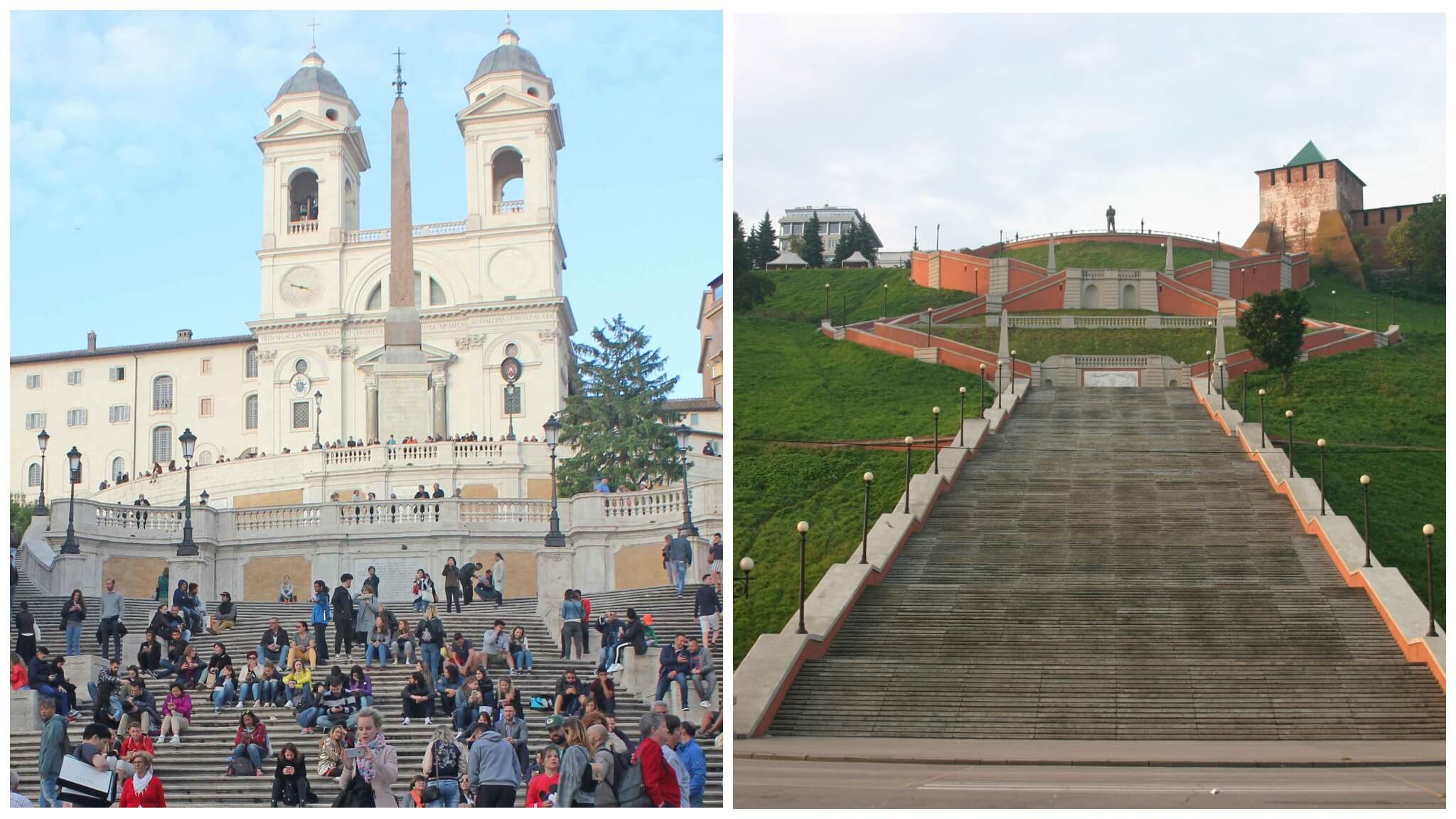 Самая длинная лестница в России — Чкаловская в Нижнем Новгороде, и с нее так же, как и со знаменитых испанских ступеней в Риме, можно лицезреть лучшие в мире закаты. У ее начала назначают свидания влюбленные парочки и приезжают фотографироваться молодожены, то же самое делают и романтичные итальянцы у фонтана «Баркачча». Но если у римской лестницы ступеней всего 135, то у Чкаловской — 560.