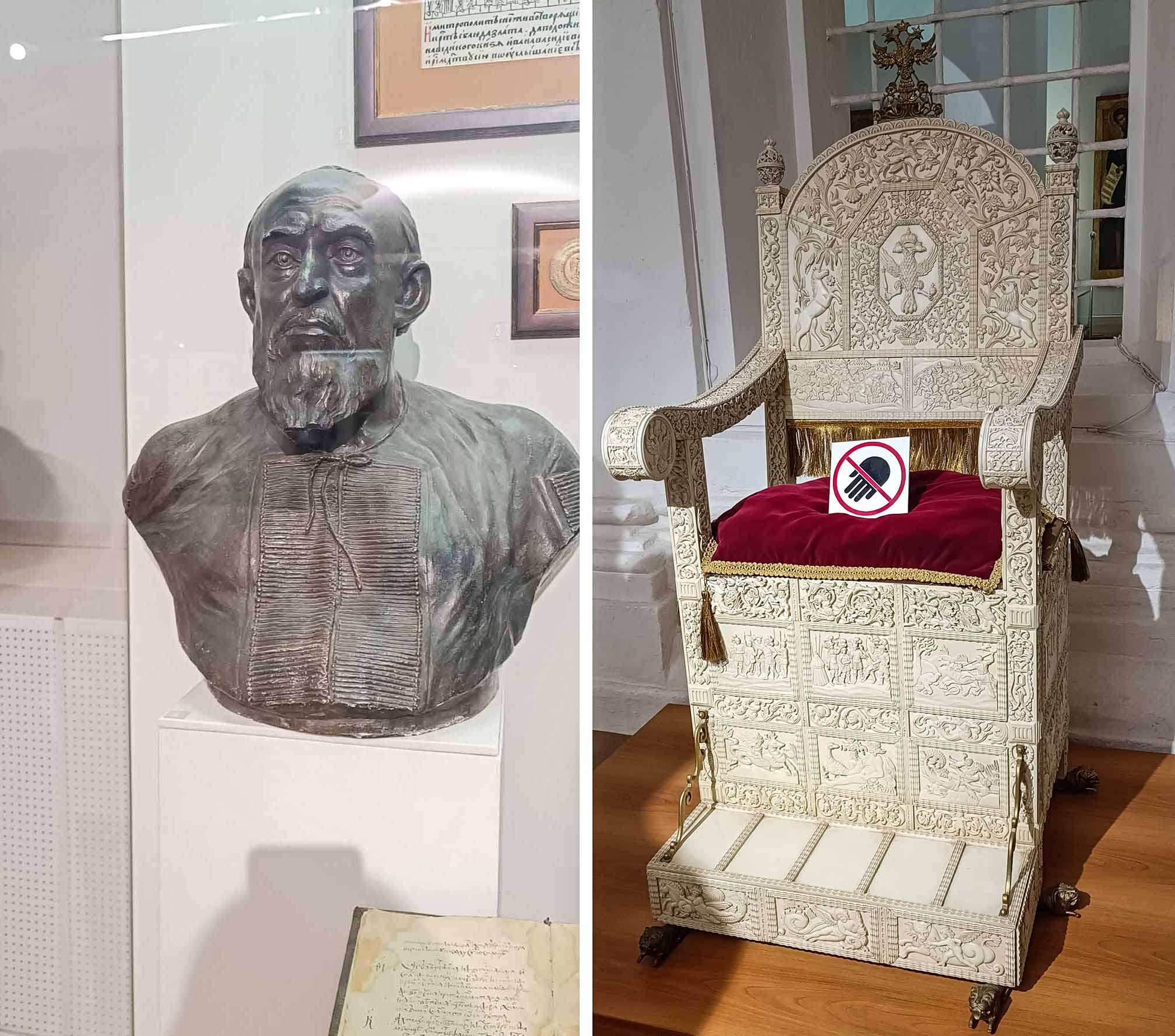 Дальше – больше. Вам покажут не только как выглядел Иван Васильевич в реальности (восстановить его облик смог скульптор и антрополог Михаил Герасимов в 1964 году), но и копию знаменитого костяного трона, на котором он сидел (хотя современные исследователи сомневаются, что трон и правда его):