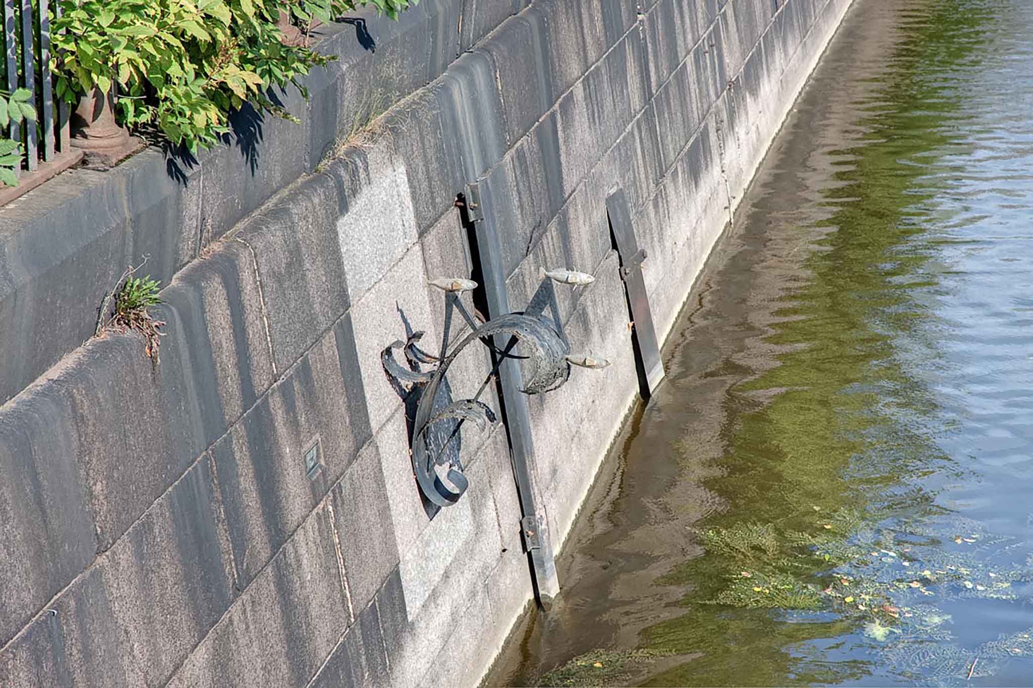 Не путать с корюшкой! Когда окажетесь в Кронштадте, пройдитесь до Синего моста и присмотритесь к стене Обводного канала. Там стоит небольшая металлическая конструкция из трех рыбок, взлетающих над волной.