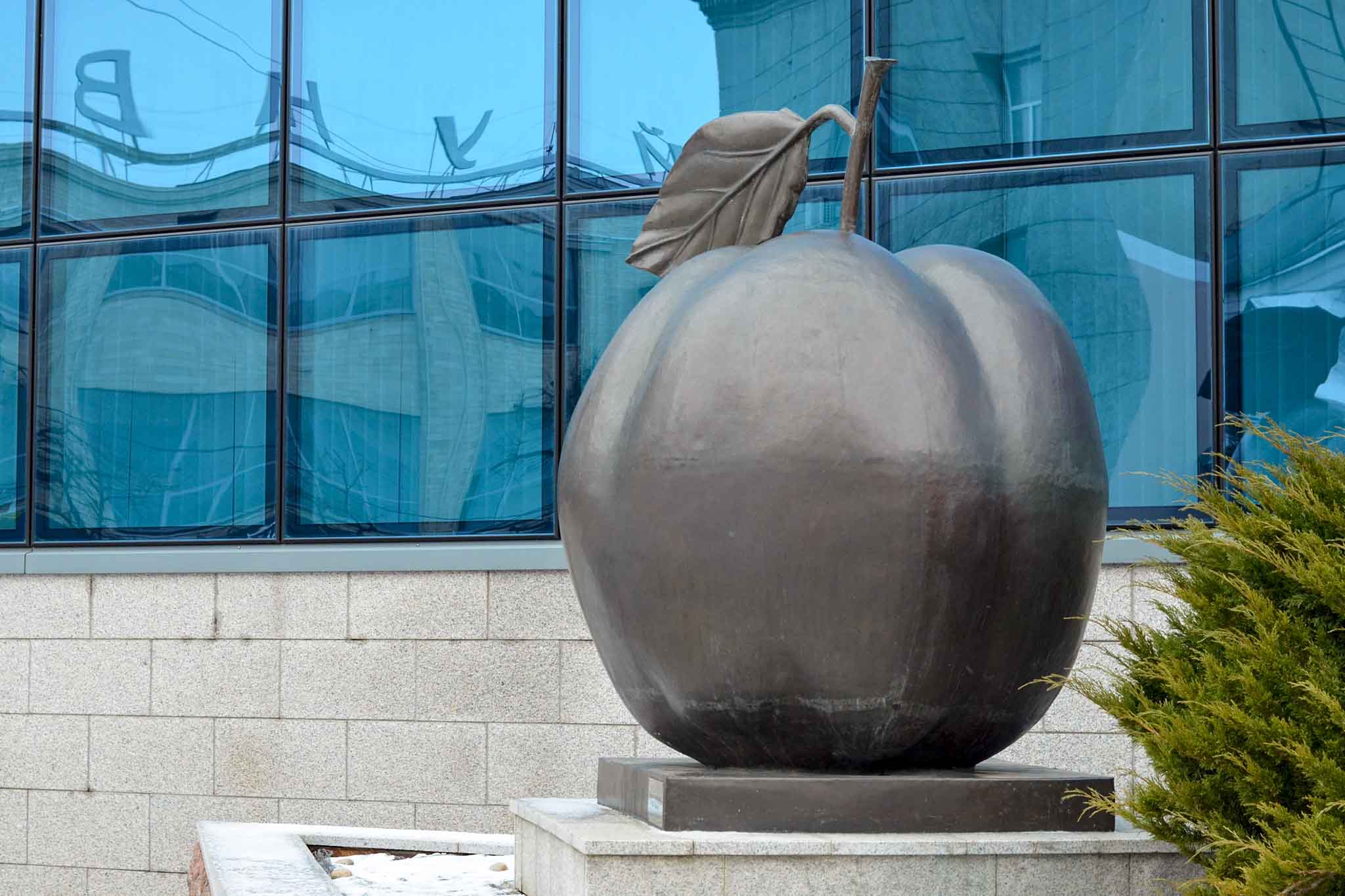 Памятник яблоку-антоновке появился в Курске в 2008 году по проекту местного скульптора Алексея Клыкова. Размер медного «яблочка» внушительный — 2 метра в высоту и 1,5 — в ширину.