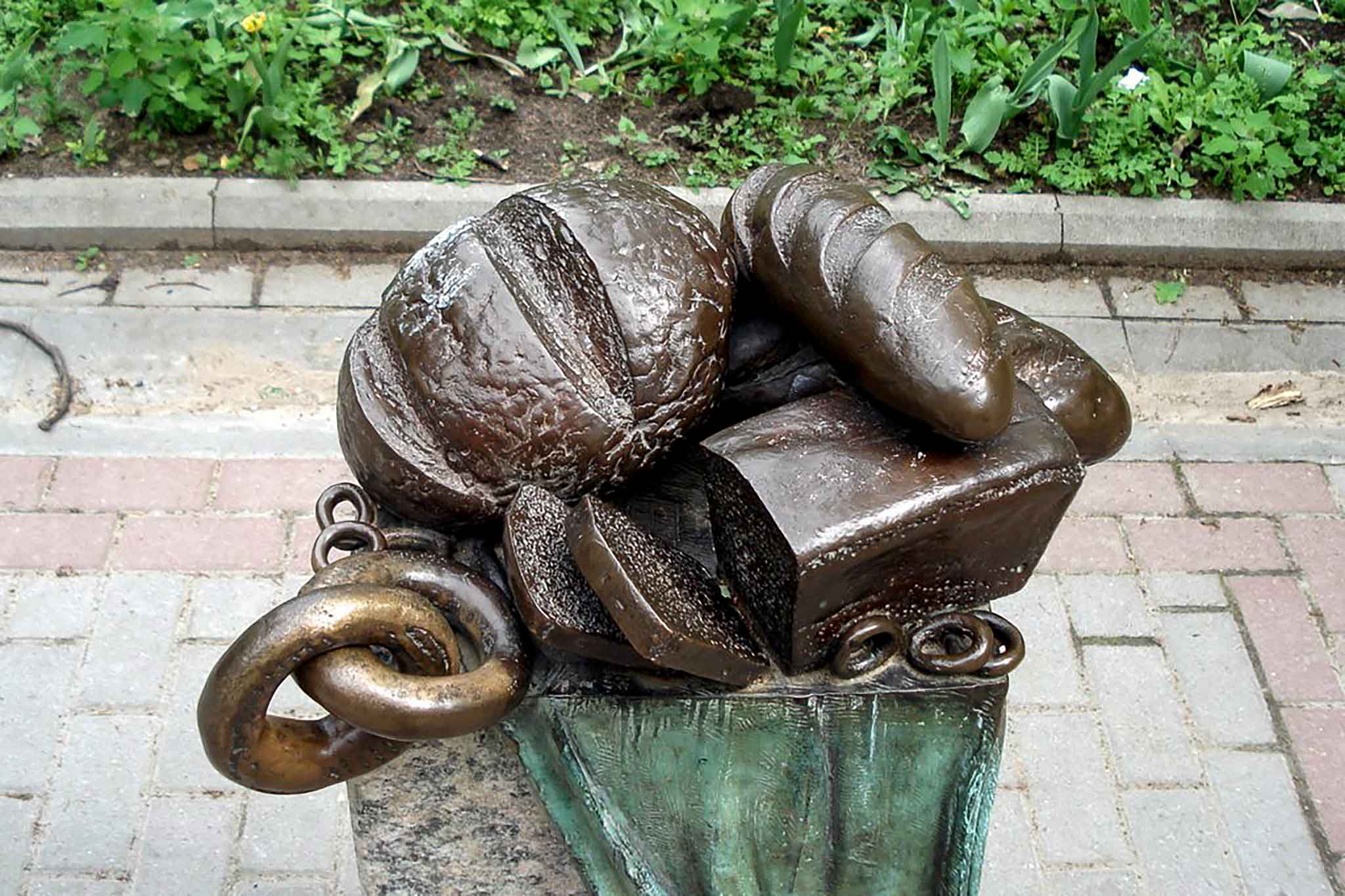 По другой версии, раз памятник стоит рядом с магазином хлебозавода, то и прославляет предприятие, ведь на монументе изображена не только буханка, но и баранки, бублики, батоны… и для самых внимательных — из-под корочки хлеба выглядывает маленькая мышка.