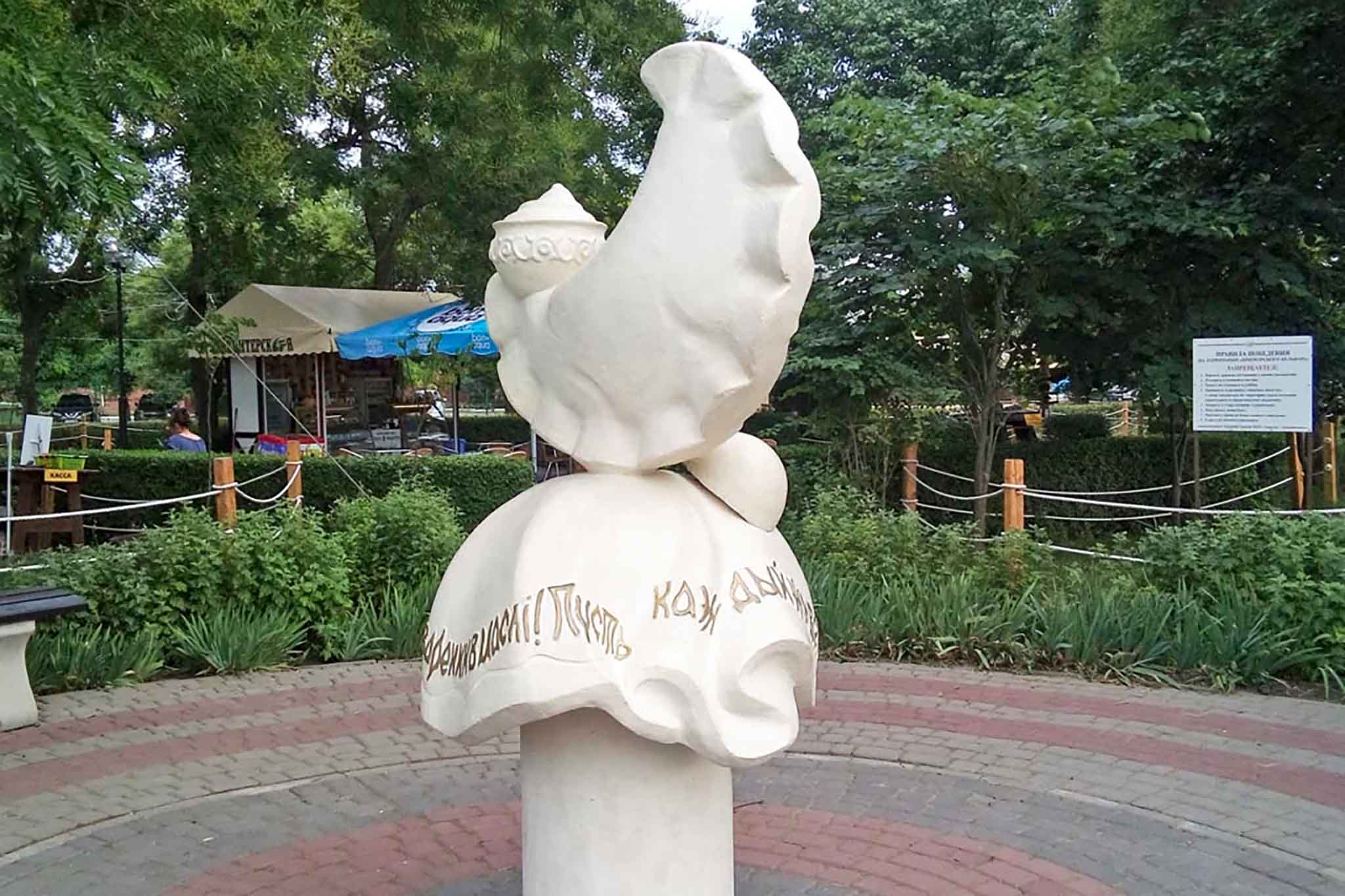 «Пусть каждый живет как вареник в масле!» — такая надпись красуется на бетонной скатерти памятника варенику. Скульптура размещена на набережной курорта в Ейске, поэтому пройти мимо не получился.