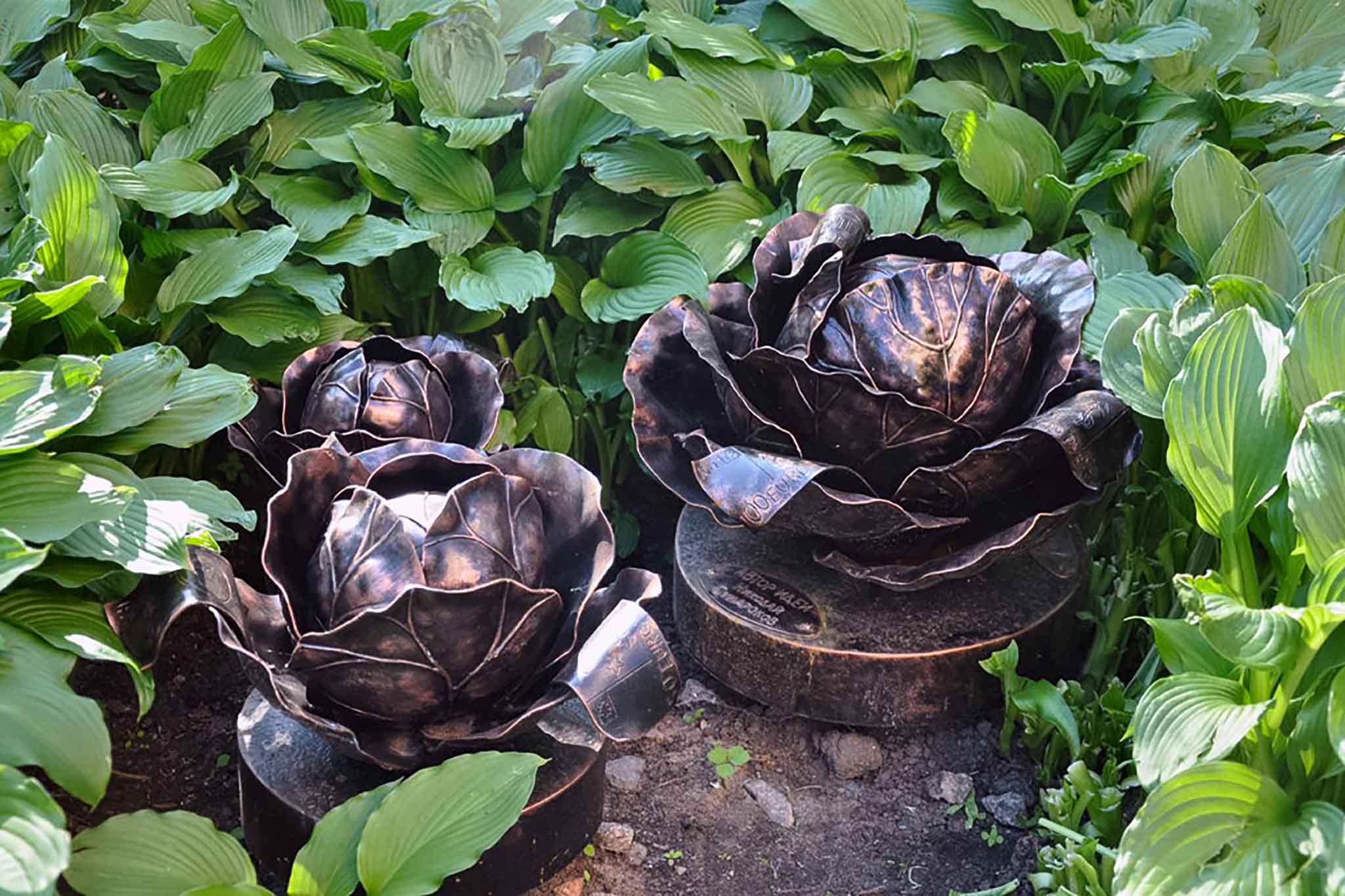 Композиция состоит из трех кочанов. Внимательный турист заметит, что каждый имеет свою валюту — между листьями спрятались купюры рублей, долларов и евро.