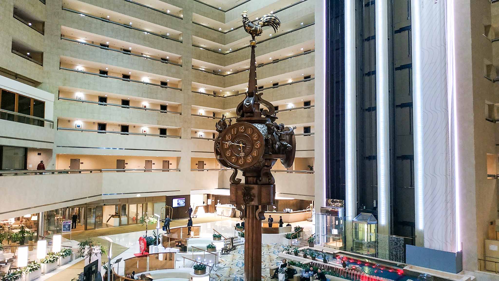 Петух, крылья которого покрыты 700 тончайшими пластинками сусального золота, исполняет свои трели начиная с полудня, чтобы не будить гостей гостиницы. Музыку для часов писала Александра Пахмутова, а вот сам голос петуха записали в одной из деревень Рязанской области.