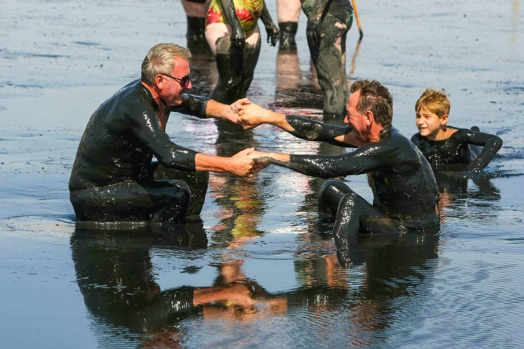 У озера уже собрались любители SPA-процедур. Они достают грязь со дна, некоторые собирают ее в пластиковые бутылки и потом на берегу наносят целительную массу — кто на лицо, кто на ноги. Остальные мажутся прямо в воде. Около меня несколько человек стоят на солнце, чтобы грязь подсохла, а потом заплывают в небольшое озеро. Оно тоже считается целебным.