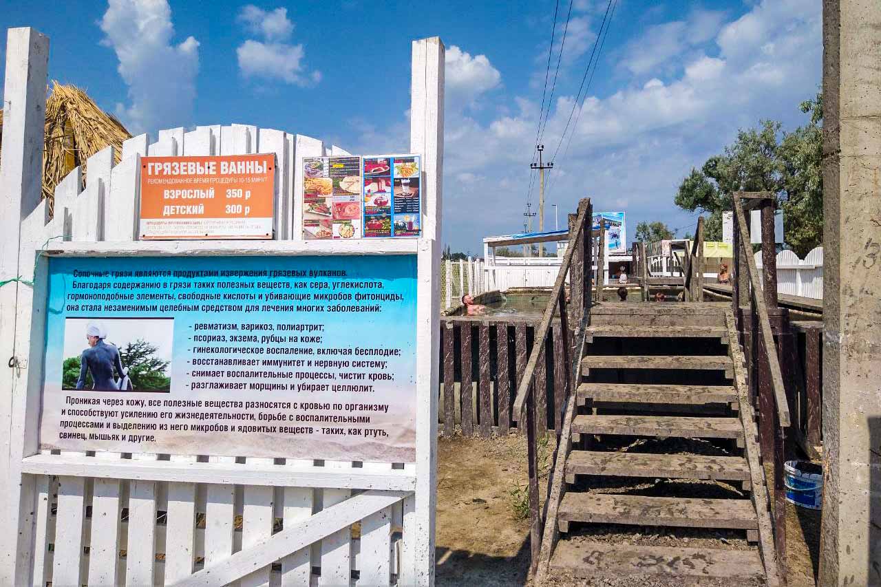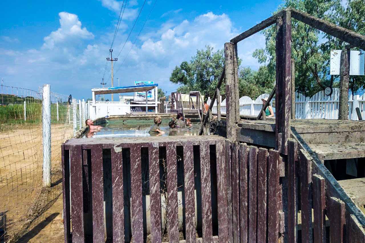 Посещение озера и грязь – бесплатные. Но рядом есть резервуар с сопочными грязями с Таманского полуострова. Ванну наполняют целебной смесью и растворяют в воде. Сюда могут поместится от 7 до 10 человек. И это удовольствие — платное. Всего 350 рублей и я захожу в бассейн с темно-коричневой жижей. Рядом со мной семья из 4 человек. Дети терпеливо принимают процедуру вместе с родителями.