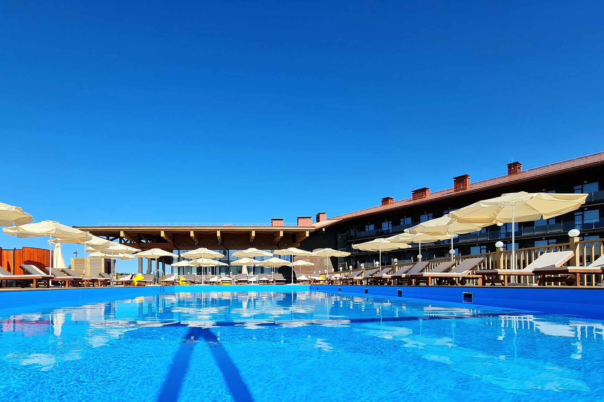 Какое же лето без купания и отдыха у воды? Об этом даже не придется задумываться, потому что в отеле есть где поплавать и вдоволь поплескаться. Для гостей открыт пляжно-бассейный комплекс с раздевалками, полотенцами и пляжным баром, где можно заказать еду и напитки. На просторных террасах у воды установлены удобные шезлонги и солнцезащитные зонты.