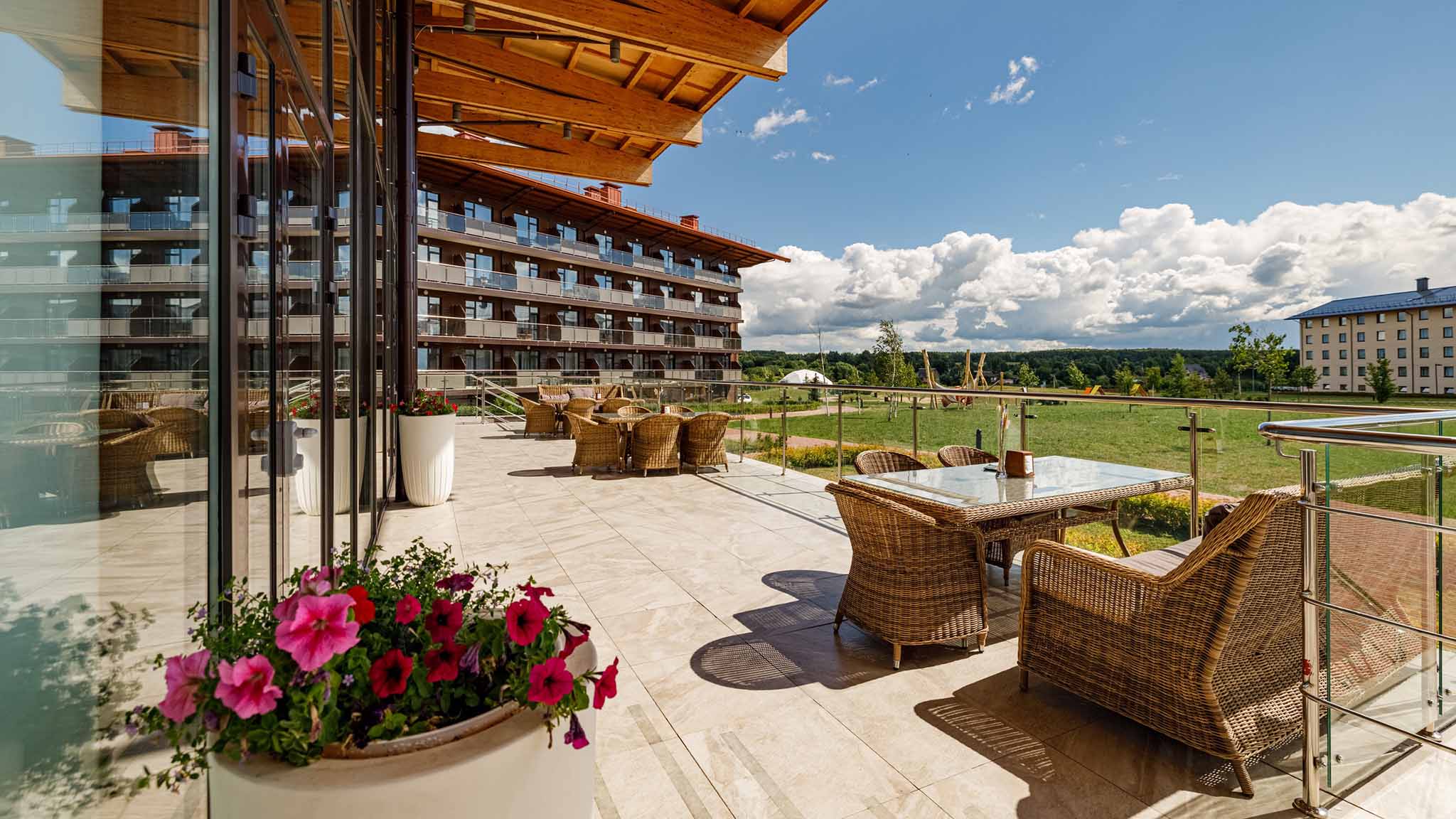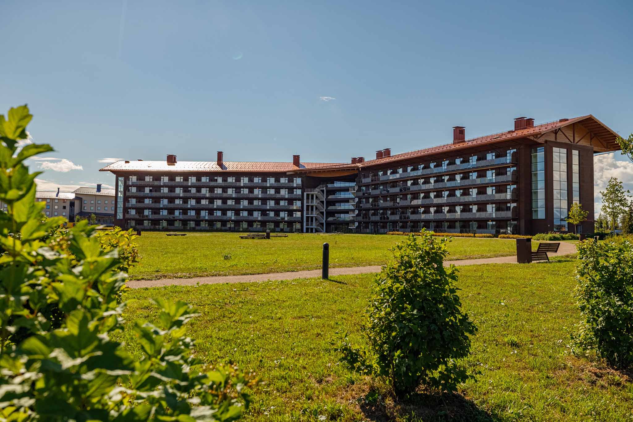 Загородный комплекс расположился на территории, напоминающей компактный городок — с корпусами для проживания, парковками, прогулочными аллеями, спортивными и игровыми площадками, SPA-зоной, фитнес-залом и местами для расслабляющего отдыха. И это пространство окружено красивыми заповедными лесами, которые отделяют парк-отель от шума дорог и напряженного ритма городов.