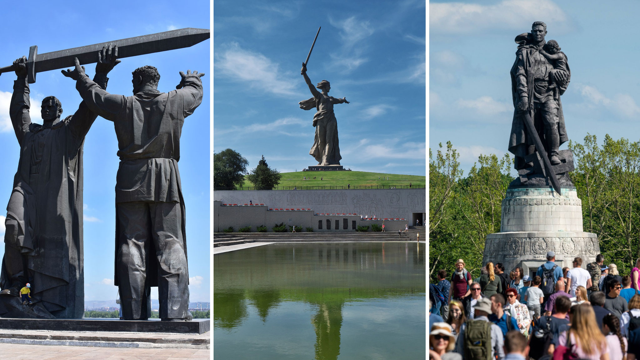 «Родина-мать зовет!» — центр триптиха. Его первая часть находится в Магнитогорске Челябинской области, где изображен рабочий, вручающий воину меч. Вторая — «Родина-мать» с мечом в Волгограде как символ Сталинградской битвы. Третья — памятник «Воина-освободителя» в Берлине.