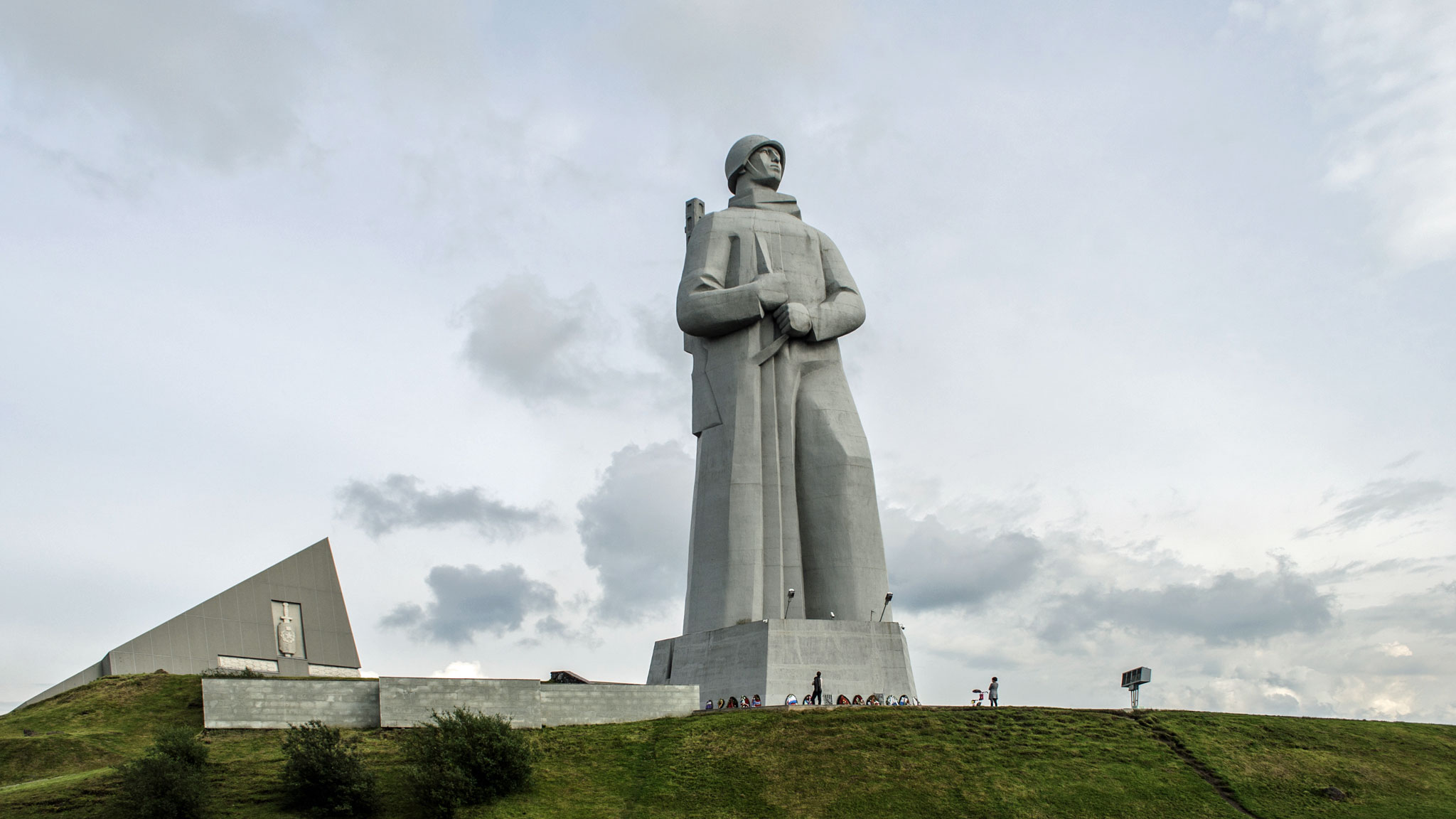 Вучетич был поклонником Веры Мухиной и ее композиционной двойственности, вот и свой главный монумент планировал сделать парным. У коленей женского символа Победы должен был преклонить голову солдат с мечом, тогда как в руках у «Родины-матери» было бы красное знамя. Но началась гонка вооружений, Никите Хрущеву срочно понадобилось, чтобы возводимая скульптура стала выше статуи Свободы, и солдата из эскиза убрали в счет увеличения высоты самой «Родины-матери».