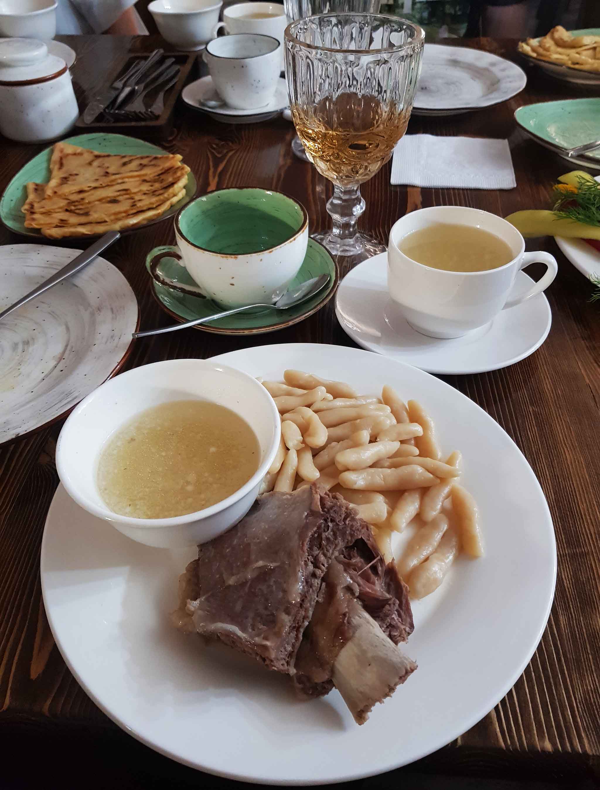 Обедать предлагают в ближайших шашлычных или кафе с бургерами, но лучше найти национальную чеченскую еду. Мы решили доехать до Ушкалойских башен-близнецов, где рядом есть чеченский ресторан Twins tower. Были и пшеничные лепешки с варенной тыквой (хингалш) и кукурузный хлеб (сискал). Самым удивительным блюдом был жижиг-галнаш.