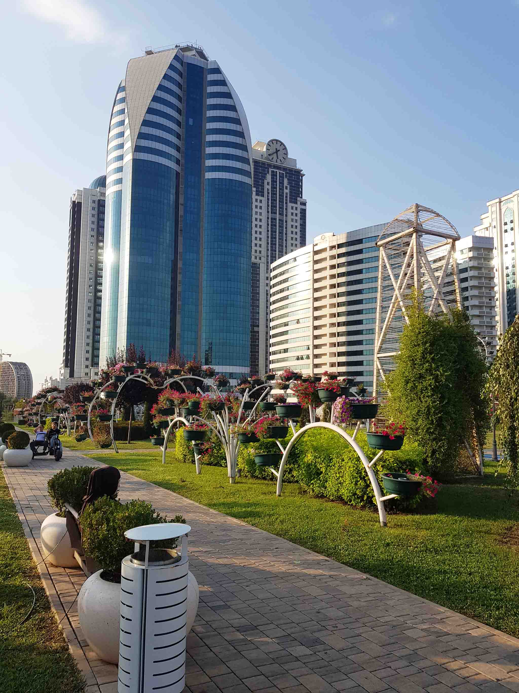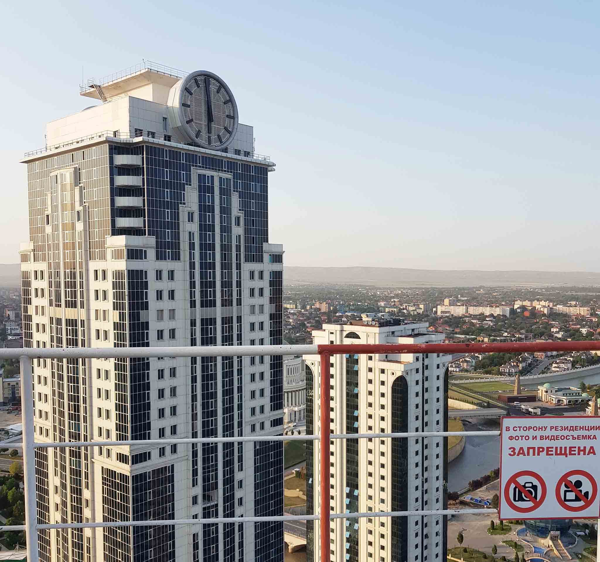 Ближе к вечеру температура в Грозном спала до +32 градусов и можно было спокойно подняться на смотровую площадку «Грозный-Сити» на высоте 110 метров.