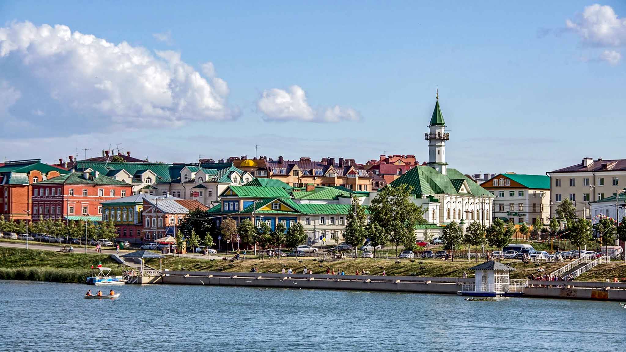 Прогулку по достопримечательностями Старо-Татарской слободы начнем с набережной озера Кабан. Отсюда открываются интересные панорамы противоположного берега Казани и красивый вид на драмтеатр Камала.