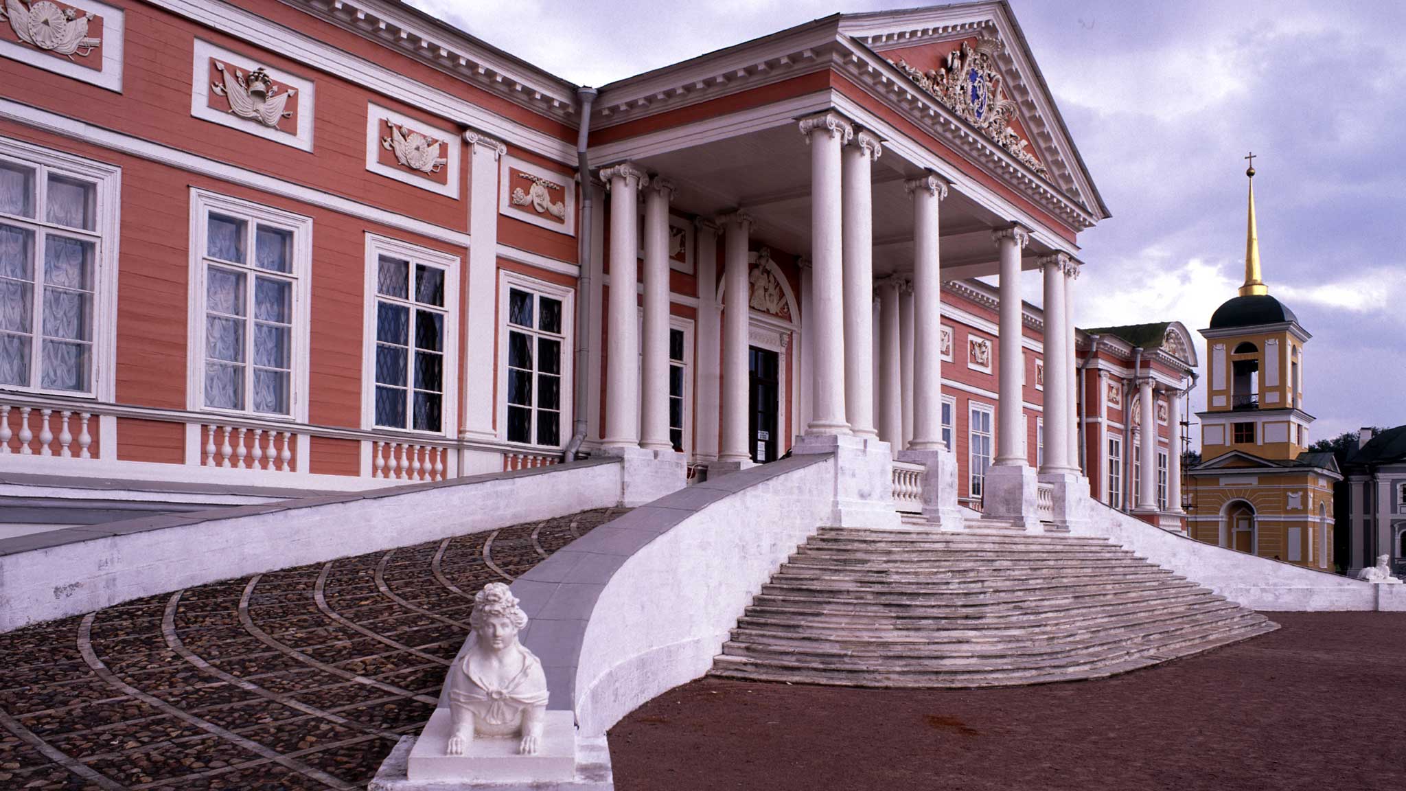 Лестница главного усадебного дома ничем не уступает по антуражу французским замкам. Белокаменная лестница и украшенные сфинксами пологие пандусы, которые в свое время служили для въезда карет, добавят любому снимку эффект театральности и сказочности. Девушки чувствуют себя здесь настоящими графинями, поэтому нередко для фотосессий надевают длинные вечерние наряды. Потрясающими будут как кадры со стороны центрального портика, так и с видом на парк.