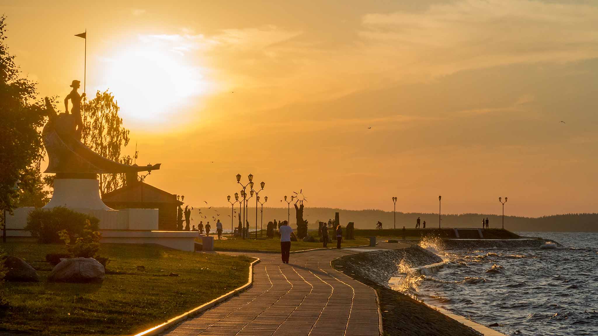 Хотя климат в Петрозаводске умеренный, он приравнен к районам Крайнего Севера. Карельское лето прохладное, а зима долгая, снежная и мягкая. Средняя температура января -7…-13 °С. Столица Карелии лежит на берегу огромного Онежского озера. Город называют портом пяти морей — через систему рек и каналов отсюда можно попасть в Каспий, Черное, Белое, Баренцево и Балтийское моря.