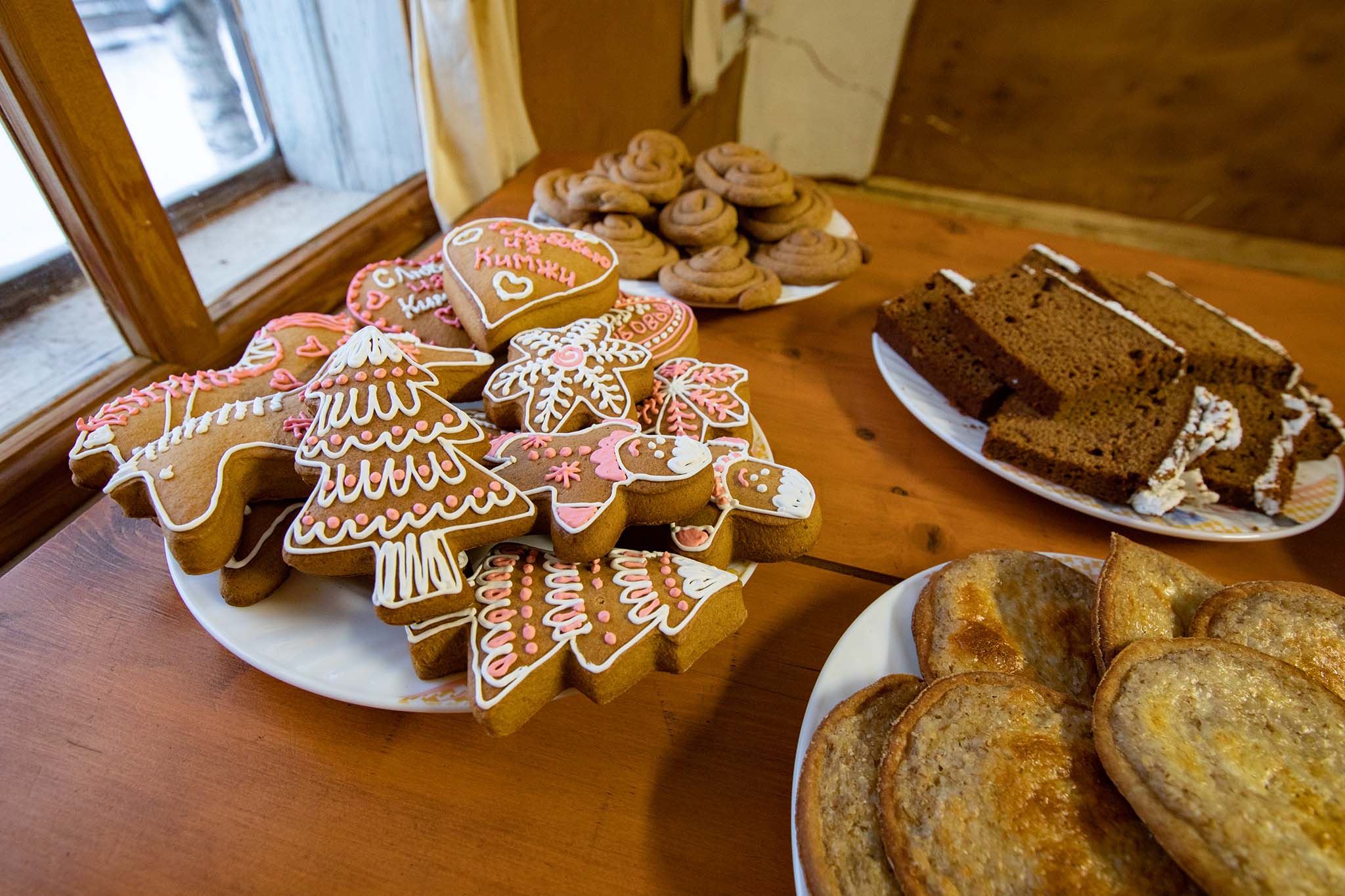 В паужне угощают местным: треской, запеченной с картошкой, козулями из житной муки и расписными козулями, заспенными шаньгами. И отдельно предлагают черный пряник с кофе.